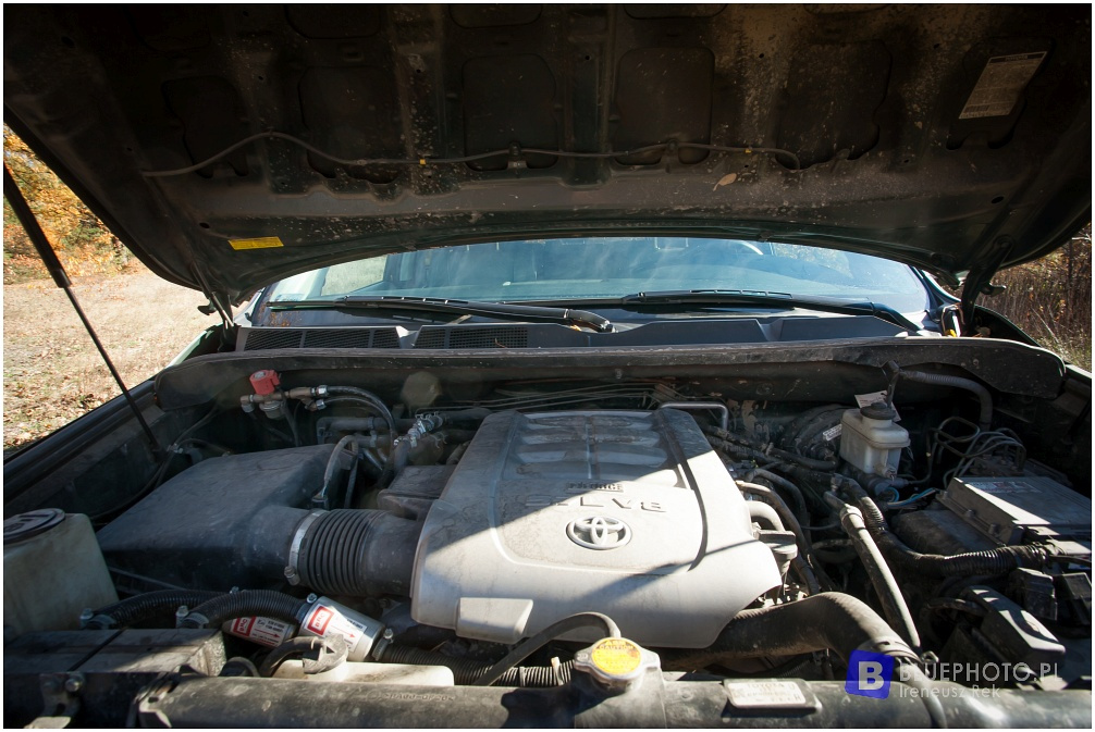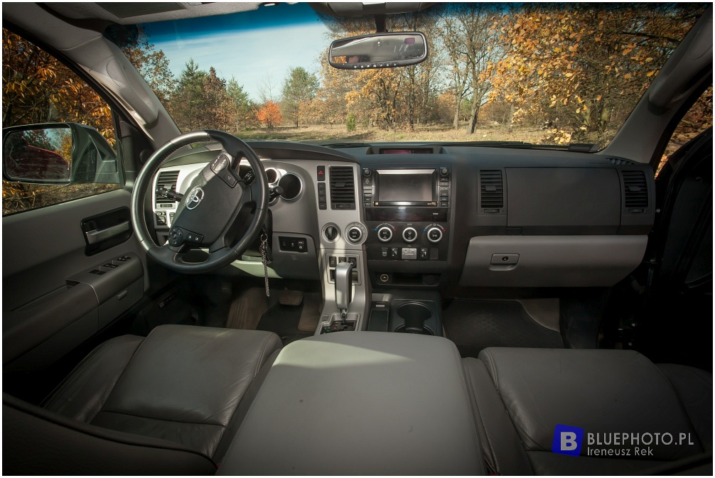 Patrząc z bliska na to ogromne auto, trudno uwierzyć, że jest to... skrócona o pół metra i pozbawiona skrzyni ładunkowej Toyota Tundra, czyli największy produkowany pick-up koncernu. Na rynku amerykańskim od 2001 roku, jednak opisywany egzemplarz to model II generacji wyprodukowany w 2009 roku, rok po premierze. Jego właściciel, spotkany podczas ostatniego zlotu toyociarzy, organizowanego przez Land Cruiser Adventure Club we Włościejewkach pod Poznaniem, dał się namówić na rozmowę i oględziny swojej terenówki. To, co od razu zwraca uwagę, to jej niebagatelne wymiary: długość 520 cm, szerokość 203 cm i wysokość 195 cm, co sugeruje bardzo przestronne wnętrze. I tak jest w rzeczywistości! Auto pomieści osiem osób na pełnowymiarowych fotelach w trzech rzędach. Kanapy drugiego i trzeciego rzędu składają sie elektrycznie, a po złożeniu tworzą równa podłogę, wygodną do załadunku i... jako przestronną salonkę na kempingach... Jak to w autach przeznaczonych na rynek USA bywa, wnętrze wypełnione jest udogodnieniami takimi jak odtwarzacz DVD dla pasażerów, klimatyzacja 3-strefowa, gniazdka (niestety 110V), system głośnomówiący, nagłośnienie JBL, czujniki parkowania przód/tył, podgrzewane fotele, wielofunkcyjna kierownica, pojemne uchwyty na kubki i wiele innych.