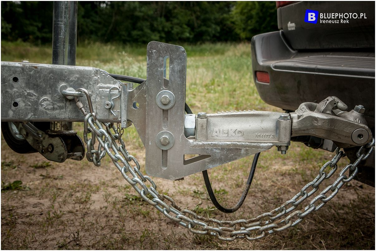 Do podpięcia zestawu posłużył zaczep kulowy renomowanej firmy AL-KO, z możliwością obrotu wzdłużnie o 360 st i poprzecznie 180st. o uciągu 3500 kg. Jego konstrukcja zdecydowanie poprawia możliwości offroadowe przyczepy, ma jednak jedną wadę - brak hamulca najazdowego (jest postojowy). Ponieważ przydałby się przy poruszaniu nie tylko w terenie, trwają prace nad systemem sterowania hamulców. Nasze auta bardzo często mają podniesione zawieszenie. Standardowo wysokość kuli haka (polska norma PN-76/S-47291) jest na poziomie 350-420mm (położenie od środka kuli do ziemi). A co gdy w holowniku po lifcie hak poszybował bardzo wysoko? Tu również pomaga autorskie rozwiązanie firmy KUMA, które pozwala na regulacje zaczepu w zakresie 420-600mm.