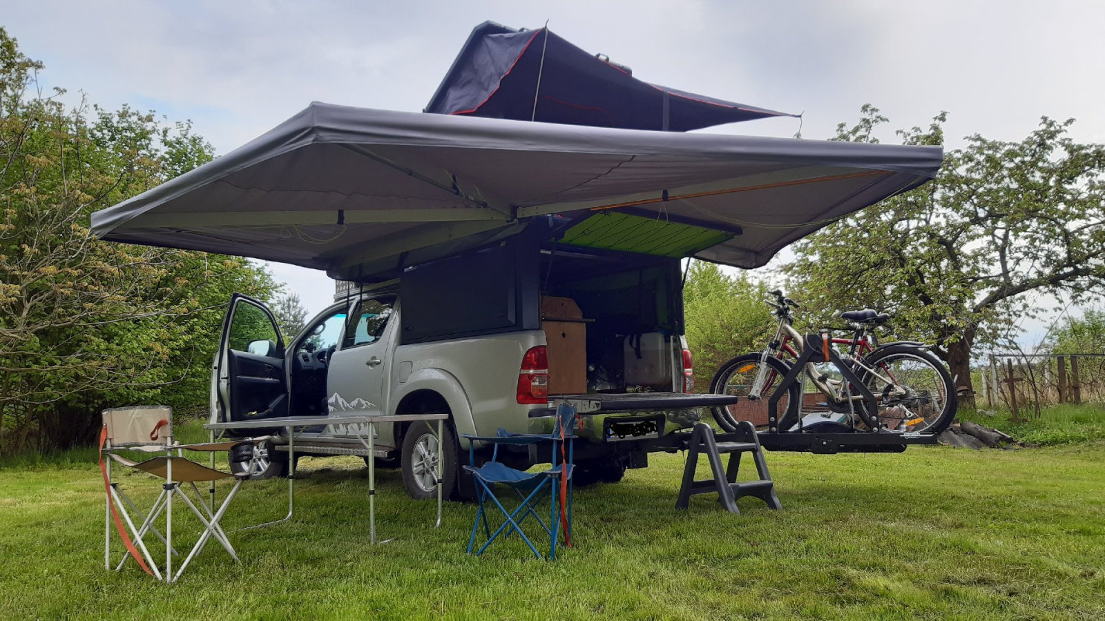 Na początek, póki nie ma tego co mi się marzy, zakupiłem zwykłą zabudowę, ale nieco podwyższoną. Doszyłem do tego namiot, zrobiłem szuflady i powstał taki bidacamper, w którym można było się przespać. Zrobiliśmy z żoną dwa wyjazdy po dwa tygodnie i było całkiem fajnie.