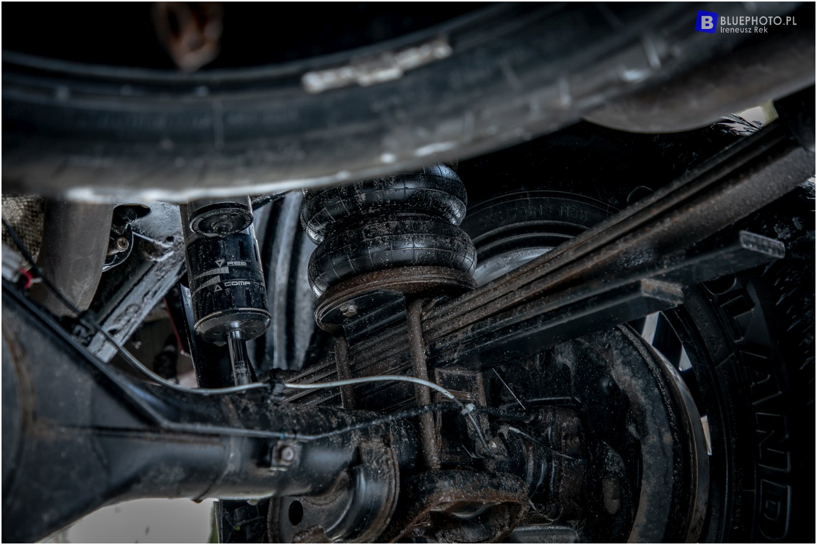 To co najważniejsze w tego typu samochodzie to osłony. Na spód trafił więc komplet stalowych od ARB. Kolejny krok, zawieszenie. Do auta zamontowano na przód i tył amortyzatory Old Man Emu BP-51 +50mm, uwaga, z regulacją, a dodatkowo z tyłu miechy powietrzne z osobnym sterowaniem prawy, lewy. Ostatni emenet układanki to opony. Mamy tu gumy odrobine węższe od fabrycznych (10mm) za to wieksze o jeden rozmiar czyli 255/70/18. Pomysłodawcy projektu wybrali Yokohamę Geolandar AT G015. Mają one swoje zalety, np. homologacje opony zimowej i w tej porze roku też dają sobie radę. W terenie, szczególnie tym lekkim również. Trzeba tylko pamietać o słabej konstrukcji bocznych ścianek. Nie mniej, na tych mniej wymagających wyprawach sprawdzą sie dobrze a na co dzień da sie ich używać bardziej komfortowo niż ich bardziej off-roadowych kuzynów (wiecej o oponach). Warto zauważyć, że felga to wprawdzie produkt fabryczny (bardzo dobrej jakości) jednak o odsadzeniu poprawionym dystansami i to nie byle jakimi, tylko najlepszymi na rynku, firmy Hoffman. Po co je stosować? O tym możecie przeczytać w osobnym artykule poswięconym temu rozwiązaniu. Aby tak wysunięte koło nie wystawało poza obrys auta dodane zostały estetyczne poszerzenia z czarnego, nie malowanego tworzywa.