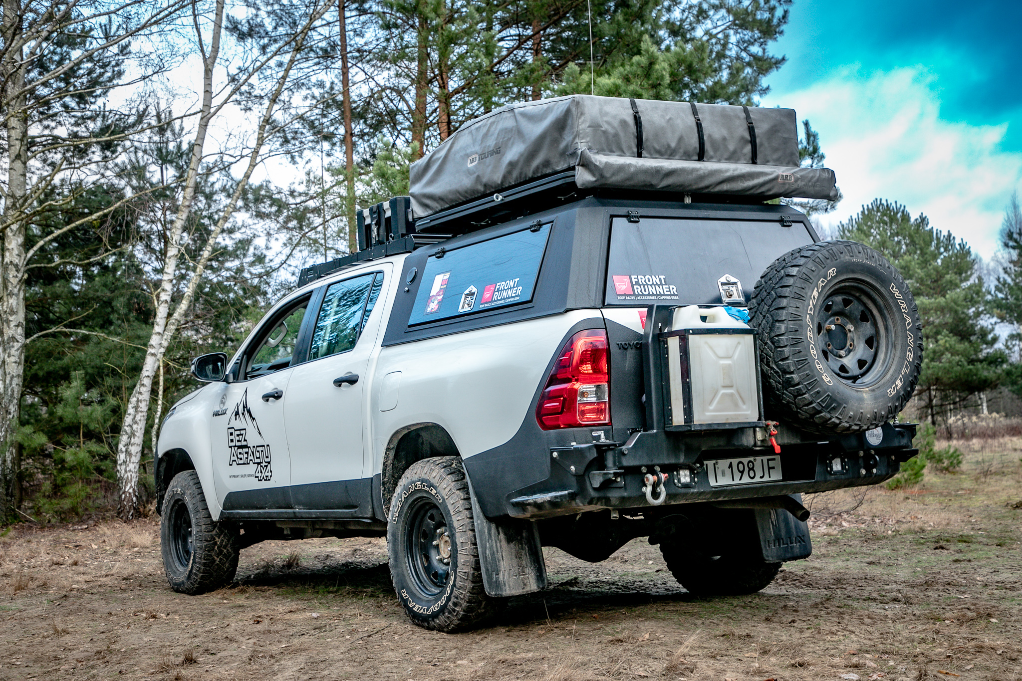 Samochód został wyposażony w zabudowę paki typu hardtop polskiego producenta Concept, a na niej spoczywa aluminiowy bagażnik dachowy Upracks i namiot ARB Simpson III z przedsionkiem, markiza tylna ARB 125 i markiza boczna FRONT RUNNER 250+ściany. Co ciekawe, całkiem nowa i jeszcze nie używana . Na dachu kabiny Wojtek umieścił bagażnik dachowy Front Runnera, na którym mocuje niezbędne na wyjazdach akcesoria. Aby to wszystko udźwignąć samochód został przygotowany i zabezpieczony od spodu kompletem osłon. Zawieszenie fabryczne poszło w odstawkę, a w jego miejsce zamontował zestaw Peddersa i większe koła na stalowych felgach.
