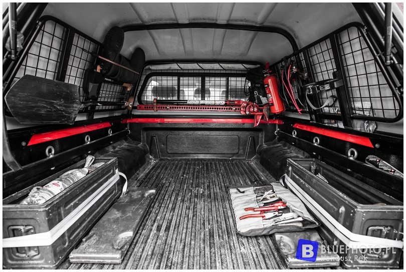 Zabudowa skrzyni ładunkowej to sprawdzony produkt ARB. Jednak nie standardowy, tu również zaszło wiele modyfikacji. Przede wszystkim listwa po bokach pomiędzy oryginalnymi zaczepami, w której jest kilka brakujących a tak przydatnych uchwytów. Poza tym pałąki wzmacniające konstrukcje do których po bokach zamocowano panele z siatki, umożliwiające podpinanie wyposażenia. Dodatkowo, niewielkie skrzynki hermetyczne z demobilu, o szerokości dokładnie takiej jak nadkola i ustawione za nimi co daje tak potrzebne schowki a nie zmniejsza światła przestrzeni załadunkowej.