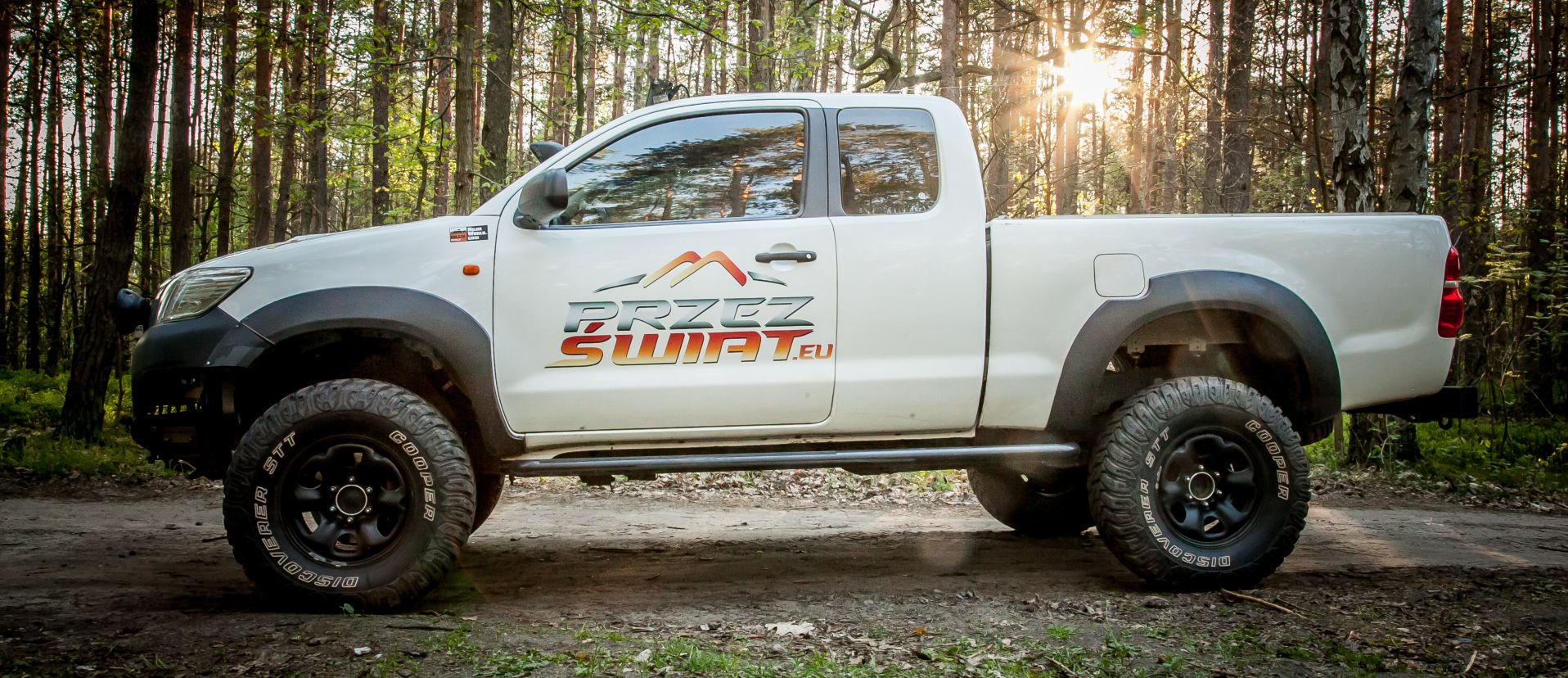 Wieloletnie doświadczenie z Hiluxami (ten egzemplarz to już trzeci pick-up Toyoty używany przez właściciela) sprawiło, że do auta założono zestaw amortyzatorów, sprężyn i wieszaków resorów OLD MAN EMU, pozwalający tylko na 2" liftu. Zastosowane sprężyny - najtwardsze z możliwych (do 150 kg) dedykowane do auta z wyciągarką i stalowym zderzakiem pozwalają na dynamiczne pokonywanie przeszkód. Większe podnoszenie pojazdu w przypadku Hiluxa nie sprawdza się. Auto gorzej się prowadzi i zawieszenie poddawane jest większemu zużyciu, przez co może być bardziej podatne na awarie. Aby zmieścić większe opony w rozmiarze 33" dodano "body lift" o wysokości również 2" oraz dodatkowo podcięto zderzak. Jego poszycie jest łatwo zdejmowane razem z atrapą chłodnicy i lampami, co dodatkowo pozwala na łatwiejsze operowanie przy wyciągarce w razie problemów.