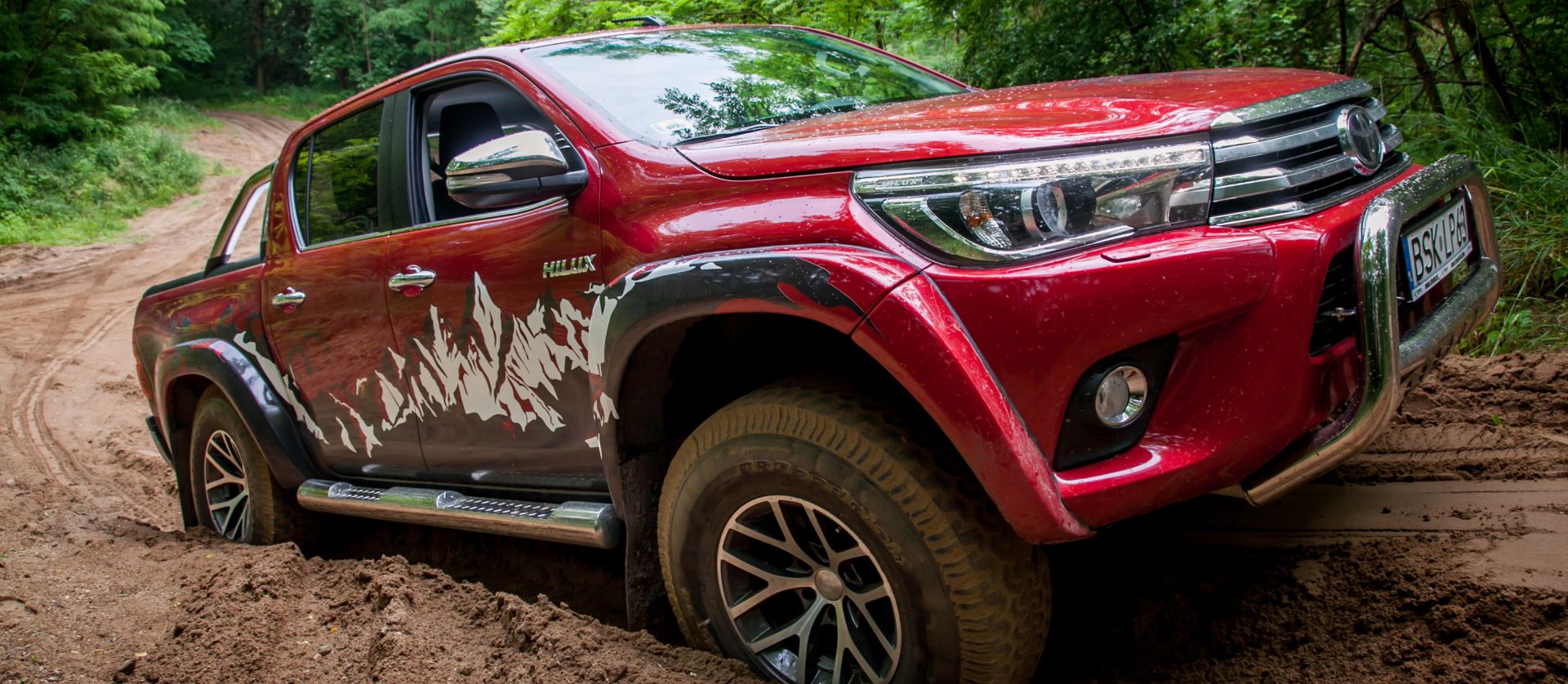 We Włosciejewkach, podczas Toyota Offroad Festivalu do testowania mielismy najnowszą Toyotę Hilux przygotowana przez firmę. Jest to auto zbudowane wg specyfikacji AT35. Na Islandii Arctic Truck ma w swojej ofercie trzy stopnie modyfikacji aut: AT35, AT38, AT44 oraz AT44 dla 6x6. W Polskim oddziale dostepna jest jednak tylko modyfikacja na koła 35". Na potrzeby montażu większych, terenowych opon (AT 315x70R17) - zawieszenie w aucie zostało podniesione o około 40 mm, a nadkola odpowiednio przycięte i powiększone. Wprowadzone modyfikacje zwiększają prześwit auta o 25%, kąt najazdu do 38 stopni, a kąt zjazdu do 32 stopni, znacznie poprawiając właściwości terenowe auta. Modyfikacja pozwala na zachowanie promienia skrętu zbliżonego do fabrycznego. Auto doposażono w stopnie boczne - ułatwiające wsiadanie. Po przebudowie oczywiście ustawiono geomertię zawieszenia i dokonano badań technicznych.