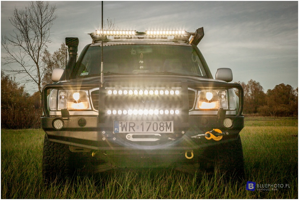 Przybyło też oświetlenie. Z przodu na orurowaniu 2 panele led spot/flop, na bagażniku z przodu listwy ledowe 2 x 120W spot oraz oświetlenie robocze ukryte sprytnie w jego konstrukcji. W reflektorach fabrycznych miejsce znalazły soczewki Bi-xenonowe z WV Passata z przetwornicami Hella.