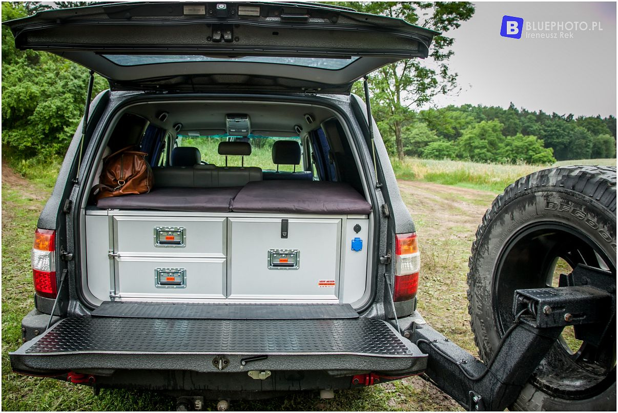 Land Cruiser 100 ma bardzo obszerne wnętrze, które znakomicie nadaje się do przystosowania do celów noclegowych. Pomysłodawcy projektu również zadeklarowani takie użycie auta. Do bagażnika trafiły więc szuflady wykonane przez firmę Auto-meble.pl. Po złożeniu tylnej kanapy w aucie można uzyskać płaską przestrzeń z materacem, bardzo wygodna do noclegu dla 2 osób.