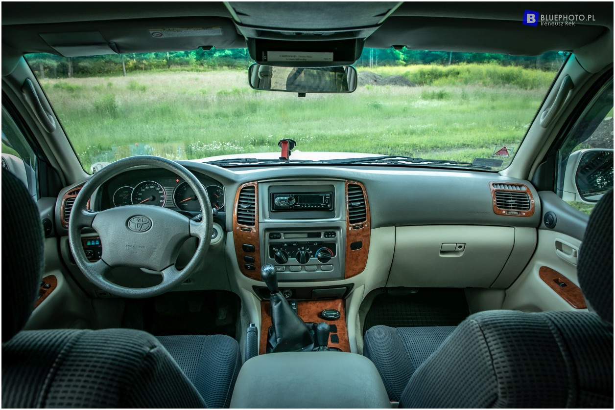 Land Cruiser 100 był w naszej części świata w większości zamawiany w najbogatszym, topowym wyposażeniu, obejmującym aluminiowe felgi, automatyczną klimatyzację, siedmiogłośnikowym systemem audio ze zmieniarką CD, elektrycznie regulowanymi fotelami z pamięcią ustawień, skórzaną tapicerką i jeszcze innymi luksusami, których 105-ka nie miała i nigdy nie były one na liście opcji do wyboru. Jednak pomimo to egzemplarz, który mamy okazje obejrzeć to jeden z lepiej wyposażonych aut tego modelu. Świadczy o tym chociażby wielość pseudo drewnianych wstawek, materiałowa (a nie welurowa) tapicerka, dywaniki (zamiast gum) czy elektryczne sterowanie szyb i lusterek. Ponieważ pojazd dedykowany był do ciężkiej pracy – posiada klimatyzację tylko manualną i zwykłe radio bez możliwości sterowania z kierownicy. Ciekawa opcją w aucie jest możliwość złożenia wszystkich foteli „na płasko” tak, że uzyskujemy jedno, duże łóżko. Oryginalnie w bagażniku zamontowane były jeszcze dodatkowe dwa fotele, dzięki czemu auto mogło zabierać 9 osób.