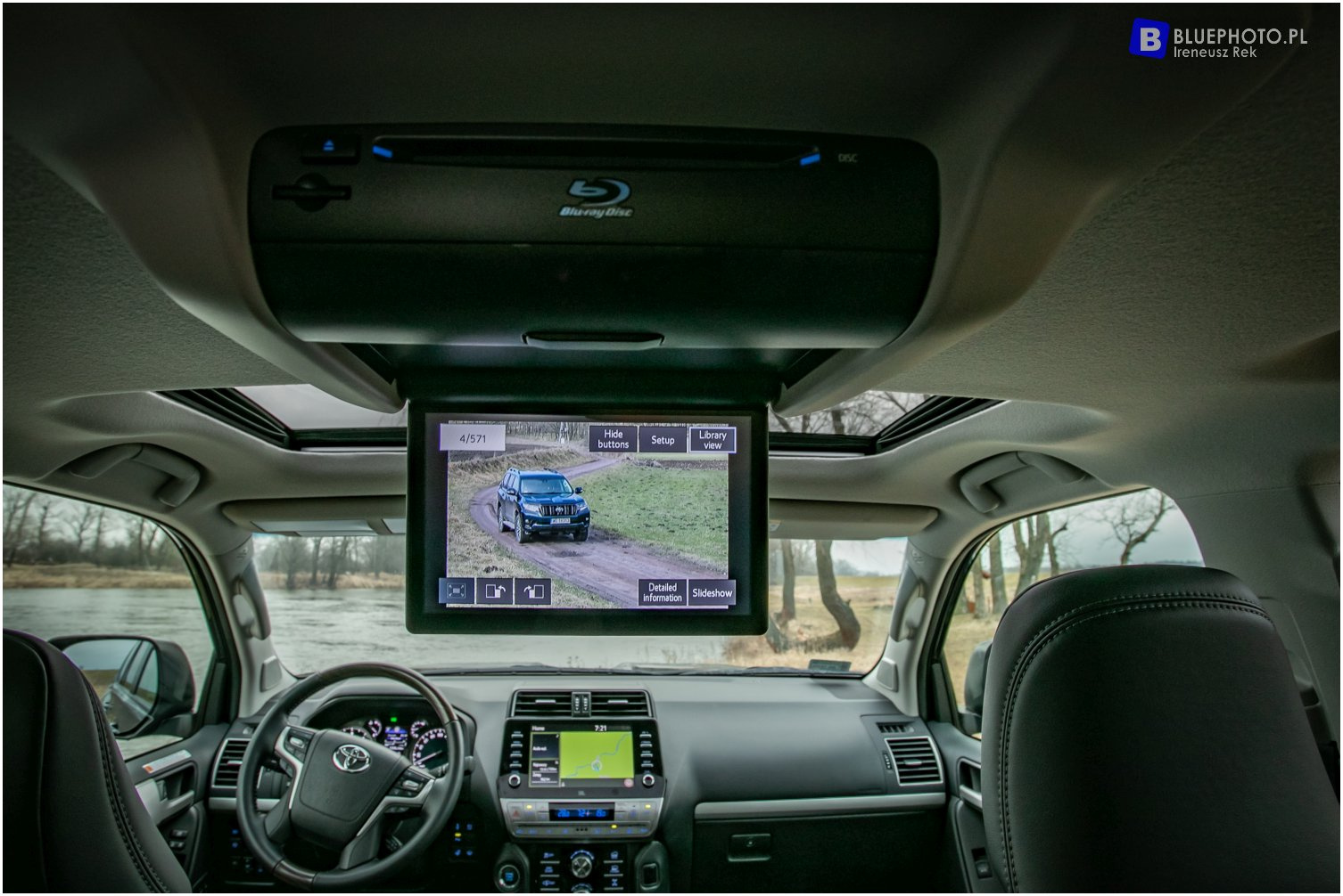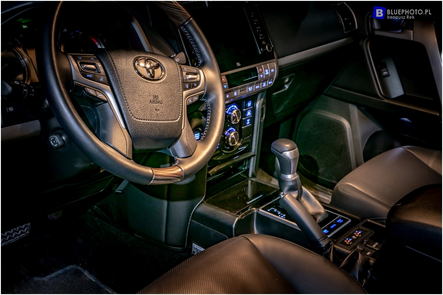 Seria Prado sugeruje, że mamy do czynienia z tym mniejszym Land Cruiserem w rodzinie Toyoty. Jednak przez lata model znacznie urósł i obecnie jego wymiary są już znaczne: długość 4840mm, szerokość 1845mm, wysokość 1855mm, rozstaw osi 2790mm. Do dyspozycji mamy najbogatszą wersję tego auta czyli Executive. Co zyskujemy wybierając tę opcję? Auto już na pierwszy rzut oka wyróżnia się przyciemnianymi, efektownymi lampami oraz chromowym gilem i nakładkami bagażnika w ciemnym odcieniu. Różnice zauważymy też w nocy, gdy podejdziemy do pojazdu z kluczykiem, załączy się oświetlenie podwozia. Najbogatsza wersja posiada również lusterka z funkcją oświetlenia przestrzeni wokół pojazdu, które dodatkowo automatycznie pochylają się przy cofaniu. A to dopiero wstęp do pełni luksusowych dodatków, które dostaniemy w środku.