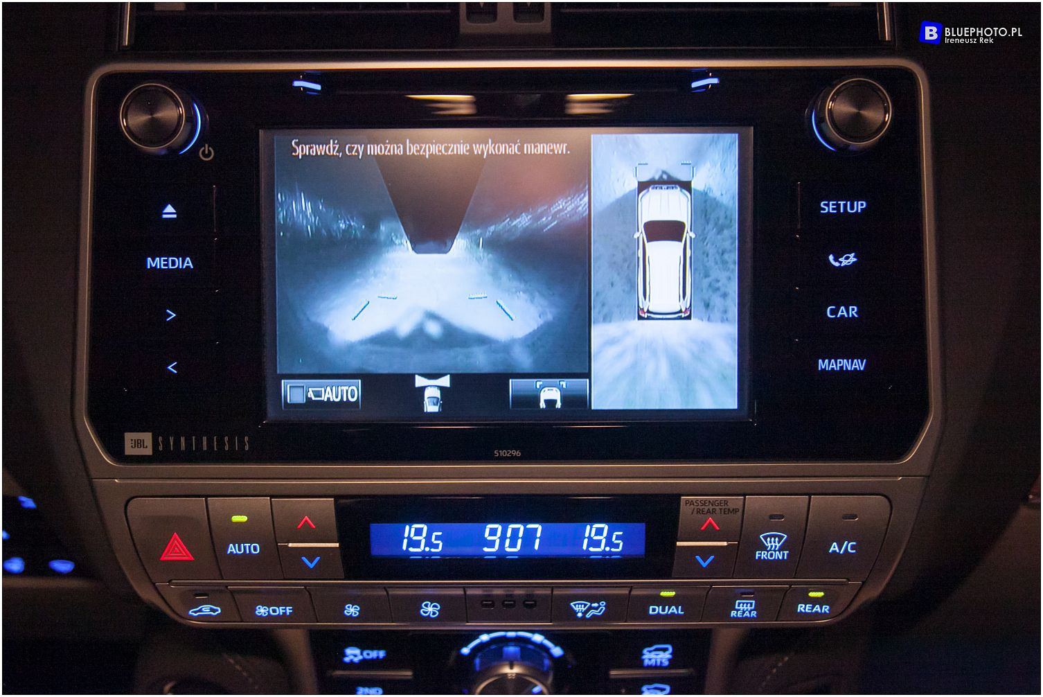 Wiekszy ekran wyświetlacza na desce Land Cruisera przydaje się jeszcze bardziej dzieki nowej funkcji Panoramic View Monitor. Po załaczeniu widoku z kamer mozemy obserować widok otoczenia samochodu w zakresie 360 stopni. Jest on niedostępny podczas poruszania się z zapiętym reduktorem (wyświetlany jest wówczas widok z przed maski i na przednie koła), jednak wówczas mamy kolejny bonus od Toyoty - nowy widok „teren pod samochodem”. Kamera nagrywa obraz przed autem i system oblicza, gdzie znajdzie się pojazd za chwilę. Pozwala to na bardzo precyzyjne kierowanie samochodem w trudnych miejscach. Jeśli poruszamy się powoli, zobaczymy widok pod samochodem w linii kół przednich. Sprawdzone - działa!