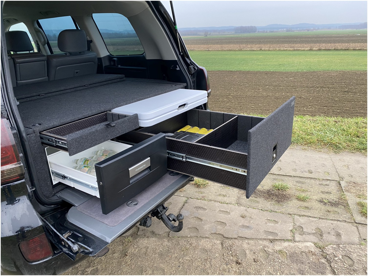 Auto które prezentujemy ma bardzo bogaty pakiet wyposażenia offroadowago. Zadbano w nim zarówno o wsparcie możliwości terenowych (regulowane zawieszenie Fox, opony, wyciągarka, osłony) jak i optymalne wykorzystanie przestrzeni bagażowej (zabudowa wykonana przez firmę Lasota4x4).
