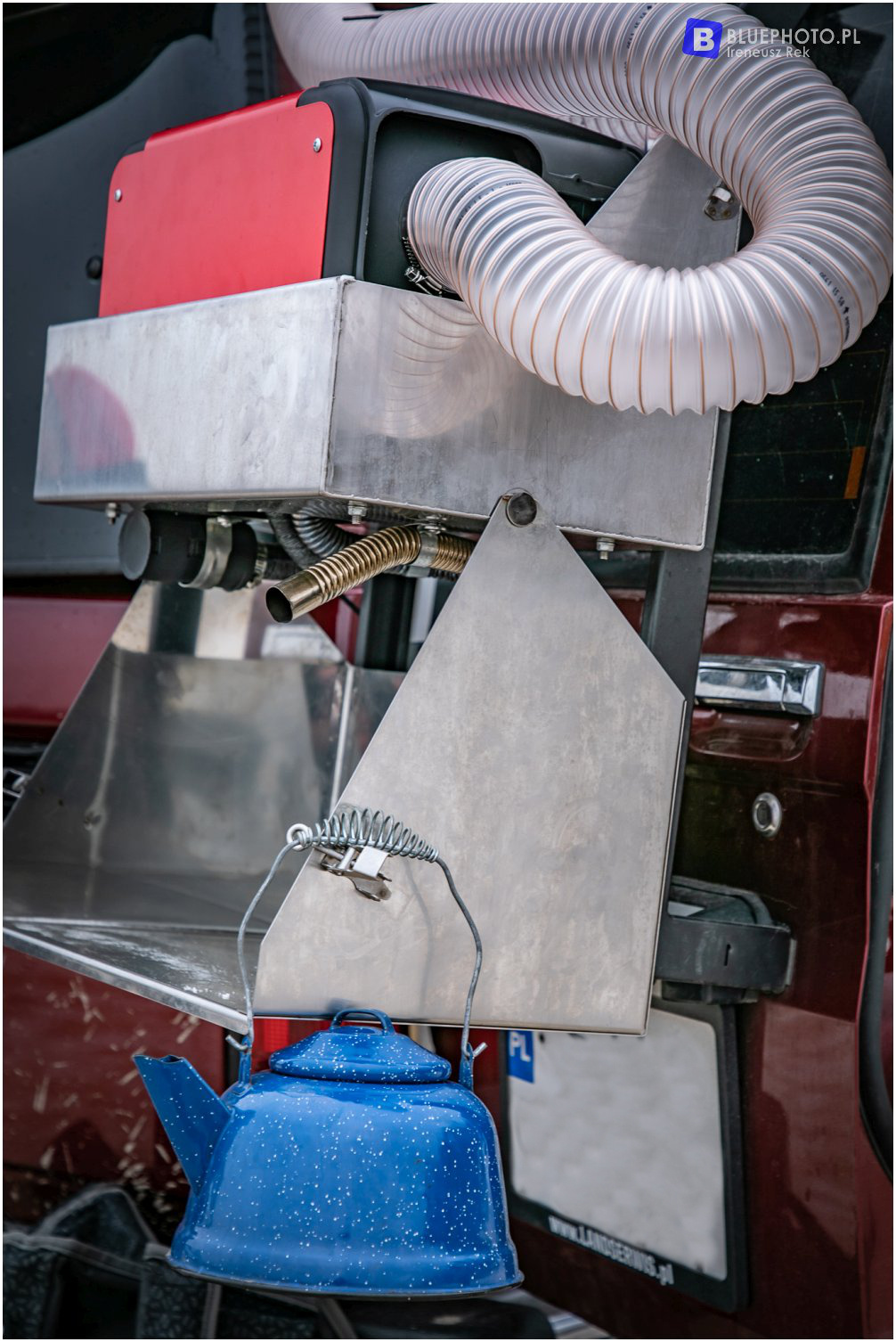 Co oprócz ciepłego śpiwora przydatne jest przy biwakowaniu na mrozie? Ogrzewanie! Rozwiązaniem zastosowanym w aucie jest Webasto, umieszczone w zgrabnym pojemniku własnego pomysłu i produkcji, umieszczone na drabince.