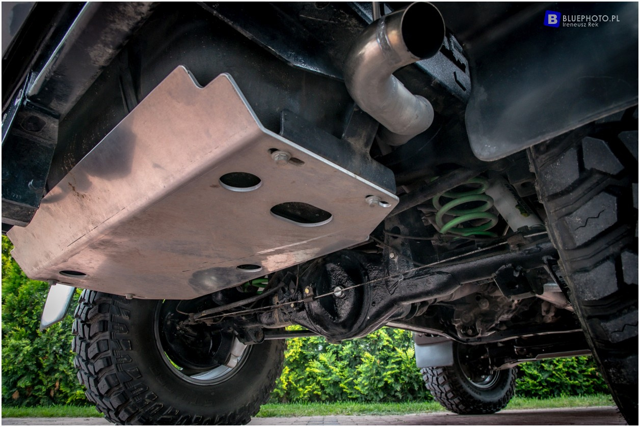 Auto terenowe powinno mieć również solidne osłony. W tym egzemplarzu zastosowano solidne, 6 mm, aluminiowe płyty chroniące przód oraz tył gdzie kryje się zbiornik paliwa.
