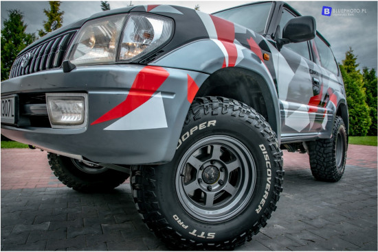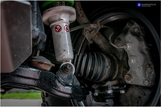 Przy poruszaniu się terenie bardzo przydaje się większy prześwit. Aby go uzyskać zastosowano w aucie 2” lift zawieszanie z zastosowaniem nowych, dłuższych sprężyn i dopasowanych do nich, dedykowanych amortyzatorów Ironmanna. Takie działanie poprawia prześwit pod przednim mostem. Dodatkowo 90-ka zyskała większe, 33” koła Cooper SST Pro, które założono na felgi z ET0 co pozytywnie wpłynęło na stabilność pojazdu. Dobrą informacja dla tych którzy maja w planach taka modyfikacje jest fakt, że po lifcie zawieszenia i delikatnym podcięciu chlapaczy z przodu taka konfiguracja wchodzi w nadkola bez konieczności większych przeróbek.