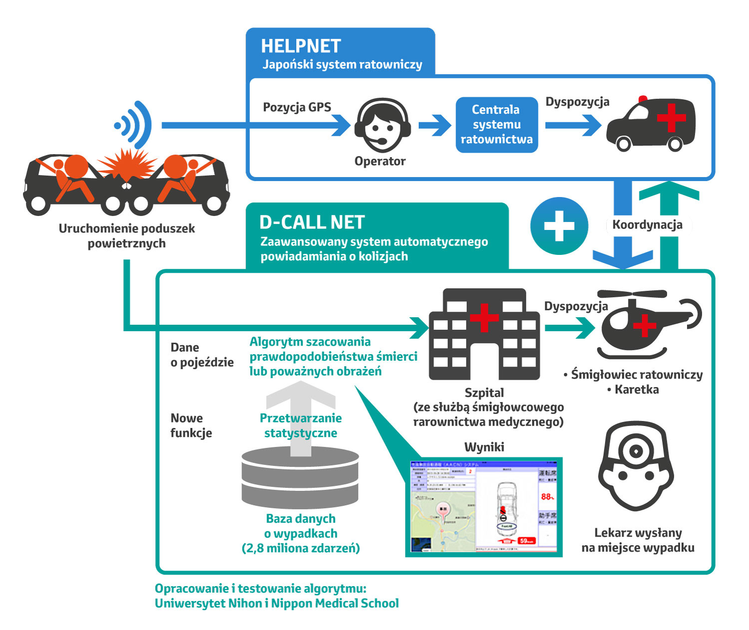 Gdy dochodzi do poważnego wypadku, niekiedy sekundy decydują o życiu lub śmierci ofiar. Japońska organizacja non-profit Emergency Medical Network of Helicopter and Hospital (HEM-Net) we współpracy z Toyota Motor Corporation, Honda Motor Co. oraz firmą Japan Mayday Service Co. zajmującą się systemami komunikacji sieciowej wspólnie opracowały nowy system szybkiego reagowania D-Call Net, który ułatwia podejmowanie błyskawicznych decyzji o wysłaniu na miejsce wypadku karetki lub helikoptera ratowniczego. Właśnie została uruchomiona faza testowa systemu.