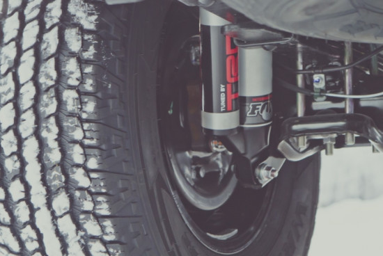 Zmodyfikowane zawieszenie wyposażono w dostrojone przez TRD 2,5-calowe amortyzatory FOX z wewnętrznym obejściem (z przodu ze sprężynami coil-over) oraz starannie dostrojone resory TRD.