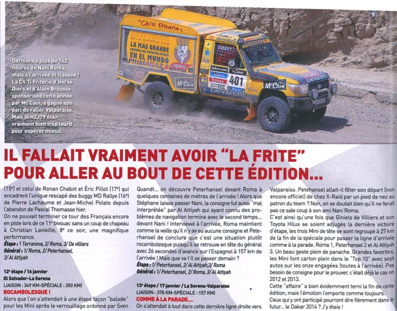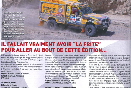 W przyszłym roku załoga Hervé DIERS/Alain BROUSSE zapuści się w piaski pustyni podczas rajdu Africa Eco Race. Poza wzmocnionym silnikiem w aucie zmieniono amortyzatory na Proflex + C2P nowej generacji, zamontowane z twardymi sprężynami. Z tyłu pozostawiono resory piórowe, jednak wzmocnione, a pojazd odchudzono o około 100 kg, aby uniknąć problemów jakie nękały auto w latach ubiegłych. Modyfikacje zawieszenia zrealizowano w Saint-Jean-d'Illac, w warsztatach Team Lardeau Competition, który będzie Team Managerem Ch'ti Friterie w wyścigu.
