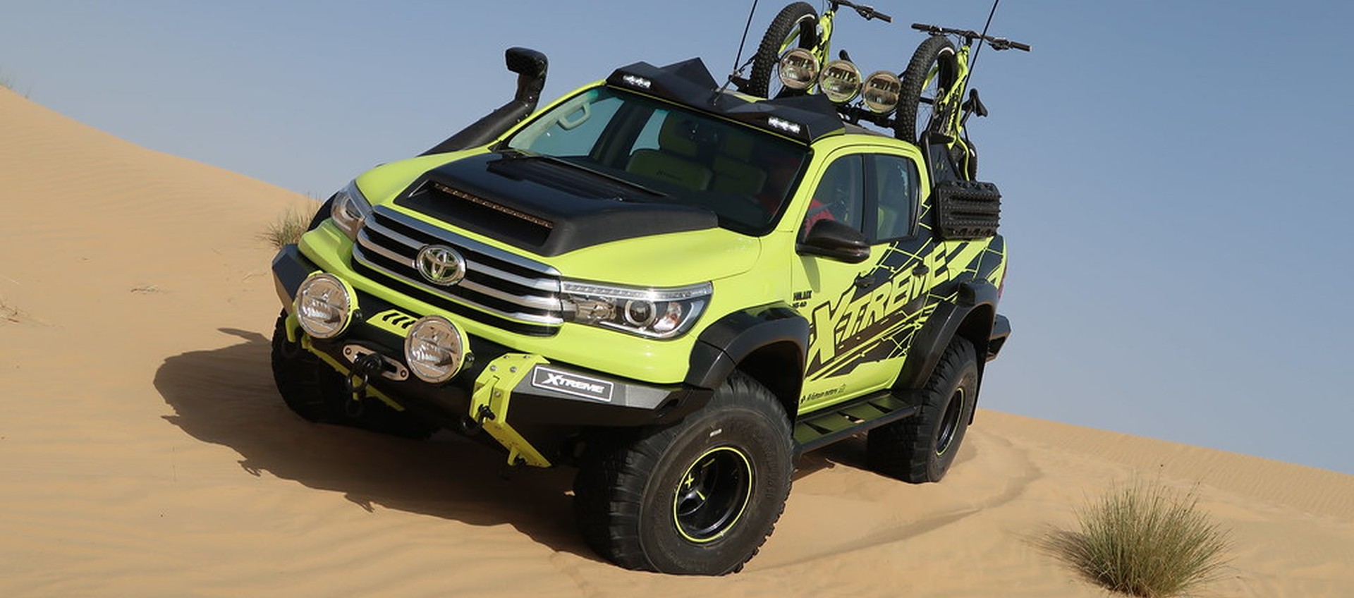 Premiera projektu nastąpiła na międzynarodowych targach motoryzacyjnych w Dubaju, w 2017 r. Co zmieniono w aucie? Jak widac na filmie poniżej pick-up zyskał solidny body lift, poszerzenia nadkoli oraz obudowę lampy led na masce (nie jest to wlot intercoolera). Poza tym pojazd wyposażono w stalowe zderzaki, w których ukryte są... węże do kompresora z manometrami. Dla każdego koła osobno, tak żeby w kazdej chwili móc obnizyć ciśnienie lub dopompowac koła. Oczywiście mamy tu rówenież wyciagarkę i ogromna ilość dodatkowego oświetlenia. Wszystko sterowane z wnetrza auta. Dla zaspokojenia wrażeń estetycznych, dla wybrednych, wewnatrz plastiki wyklejono materiałem przypominajacym z wygladu karbon (tak samo jak nadkola na zewnatrz). Jakie koła zyskał Hilux w tej wersji? Wg. specyfikacji 38x16,5x15"! Całość napędza 6 cylindrowy motor o pojemności 4 litrów i mocy 235 KM. Komplet offroadowego wyposażenia uzupełnia snotkel. Teoretycznie na pustyni raczej nie będzie problemu z głebokim brodzeniem ale jak wspominamy o tym w artykule opisującym jego zastowowanie, nie tylko taka funkcję na ta plastikowa rura.