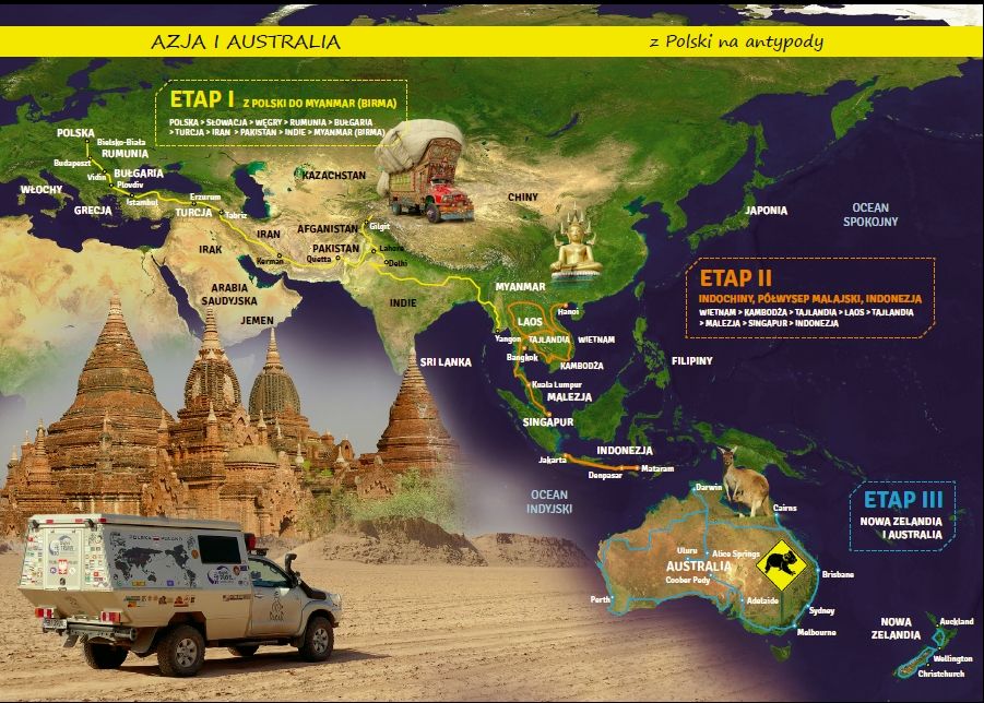 Zapraszamy do lektury fragmentów książki zamykającej ponad 10-letni objazd globu, który rozpoczeli w Buenos Aires w 2009r. i kończą na antypodach w Australii. Jest to kontynuacja czterech poprzednich publikacji, opisujących ich przygody na kontynentach obu Ameryk „Drogami i bezdrożami Ameryki Południowej” i „Kurs... Ameryka Północna”, Afryki i Azji „Przez Afrykę i Azję...nad Bajkał” i „Na dwa krańce świata”. Książka „Z Polski na antypody” to 664 stron, zilustrowanych ponad tysiącem zdjęć, przedstawiająca podróż z Polski poprzez 18 państw (Słowacja > Węgry > Rumunia > Bułgaria > Turcja > Iran > Pakistan > Indie > Myanmar > Wietnam > Kambodża > Laos > Tajlandia > Malezja > Singapur > Indonezja > Nowa Zelandia > Australia ) i dwa kontynenty.