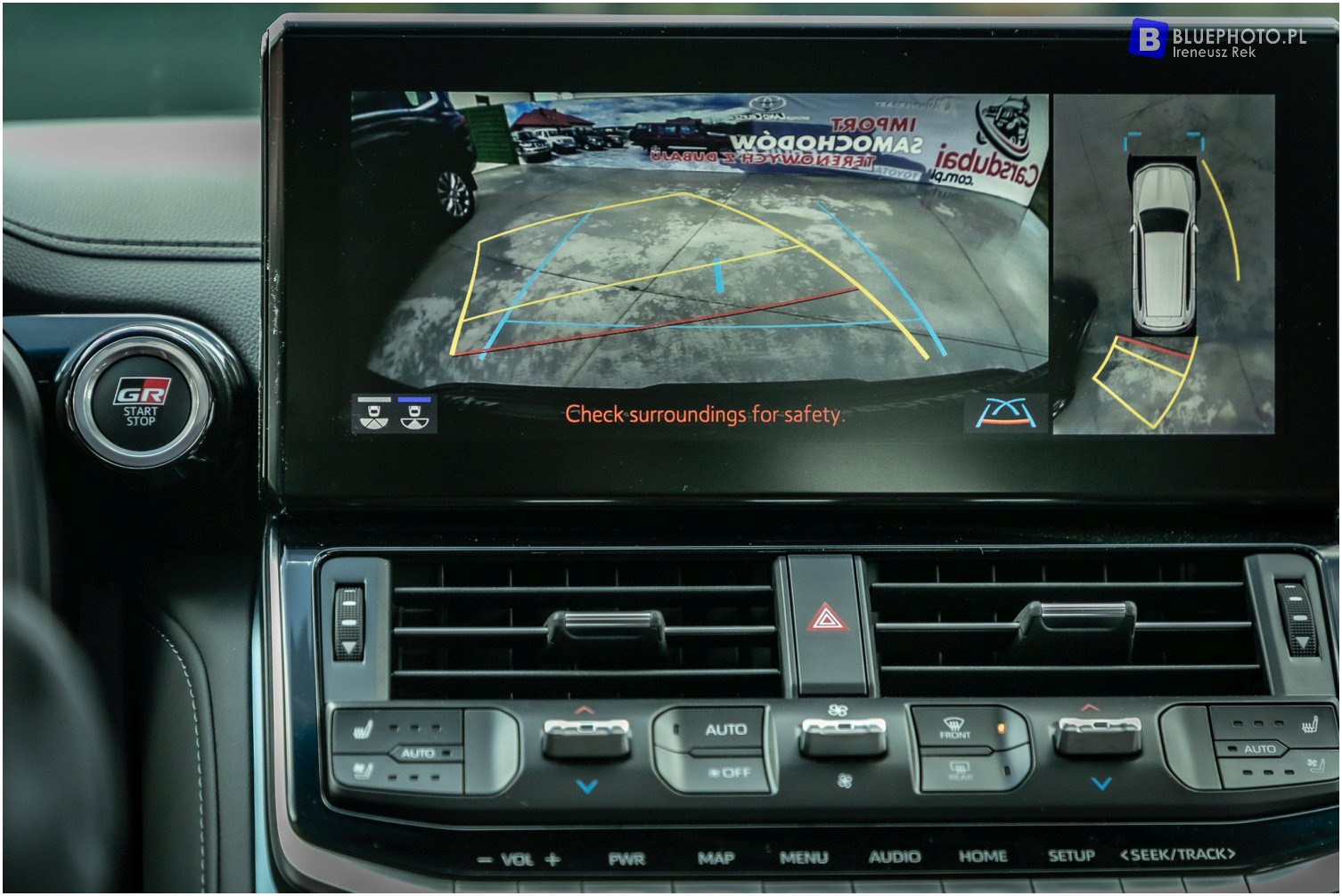 Po otwarciu wielkich drzwi (no dobra, już ostatni raz) zasiadłem w wygodnym fotelu kierowcy. Deska rozdzielcza jak w najnowszych samochodach klasy premium, daleko od poczciwej „osiemdziesiątki”. Czuć komfort rodem z marki Lexus. Podoba mi się szeroka środkowa konsola z 2 miejscami na napoje, ergonomicznie umiejscowionym drążkiem zmiany biegów automatycznej skrzyni, obok którego znajduje się przełącznik reduktora oraz przyciski do włączania blokady centralnego mechanizmu różnicowego oraz przycisk systemu wspomagającego zawracanie w ciasnych przestrzeniach, np. między drzewami. Środkowa konsola płynnie łączy się z deską rozdzielczą, nad którą góruje duży dotykowy ekran z mnóstwem funkcji, ustawień, informacji oraz nawigacją. Pod ekranem są 2 rzędy klasycznych włączników do nawiewów i klimatyzacji (świetnie wyglądają te przełączniki w stylu lotniczym) oraz sterowaniem wybranych funkcji komputera pokładowego. Wzruszyła mnie też szczelina do wkładania płyt, umieszczona pod tymi przyciskami.