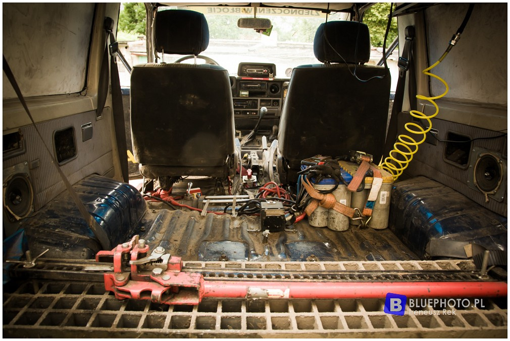 Podniesione zawieszenie i gumy to podstawa. Snorkel wydłubany własnoręcznie, wyspawane orurowanie. Z rzeczy nietypowych – do auta dołożony jest drugi alternator, aby wystarczyło prądu do ładowania dwóch akumulatorów żelowych, mocna wyciągarka elektryczna umieszczona centralnie w aucie, intercooler dorobiony z osobówki, kompresor do pompowania kół, opony z wewnętrznym beadlockiem, umożliwiające jazdę z ciśnieniem powietrza nawet 0,4Atm. To auto to dowód triumfu człowieka nad materią. Żeby jeździć lepiej potrzebne są modyfikacje. Żeby nie płacić za te zmiany krocie, potrzebna jest pomysłowość. I oni to mają…