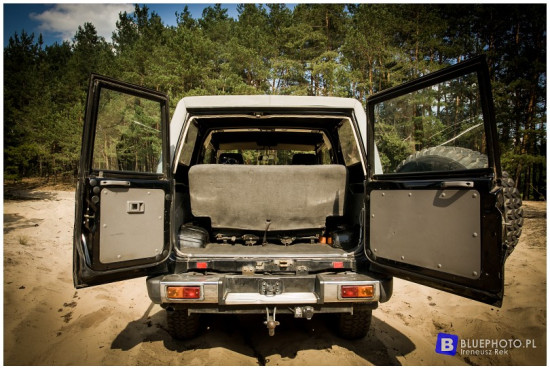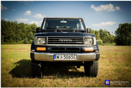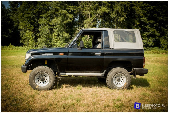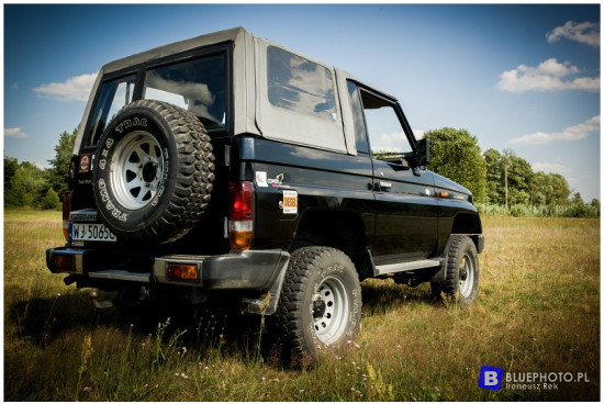 Opisywane auto to model LJ70 z 1992 roku, wyprodukowany już po zmianie wyglądu karoserii i podniesieniu mocy dieslowskiego silnika do 90 KM. Przez pierwszego właściciela używane do rekreacyjnych wycieczek wśród kanałów i wiatraków Holandii. Do Polski sprowadzone przez myśliwego, który zamierzał przysposobić je do przemierzania leśnych ostępów jednak na zamiarach się zakończyło. I może bardzo dobrze, bo dzięki temu, poza zmienionym zawieszeniem na Dobinsons +2 cale i oponami FULDA 4x4 w rozmiarze 31", jest zachowane w idealnym, oryginalnym stanie. Co ciekawe miękki dach pomimo upływu dwudziestu kilku lat jest elegancko i mocno napięty, szczelny i zachowany w całości, łącznie ze wszystkimi suwakami używanymi do odchylania bocznych połaci. Pod maską auto bardzo żwawo rozpędza silnik diesla 2,4l 2L-T II. Do pokonywania terenu służy dołączany ręcznie napęd przednich kół, jednak zaopatrzonych w bardziej komfortowe rozwiązanie czyli automatyczne sprzęgiełka, co oznacza, że aby włączyć napęd 4x4, nie trzeba wysiadać z kabiny auta, jak to się dzieje w przypadku sprzęgiełek manualnych, w które wyposażano większość 70-ek. Podobno jest to rozwiązanie bardzo awaryjne, jednak obecny właściciel nie raportuje tego problemu pomimo, że auto obowiązkowo stawia się na każdym Toyotowym spotkaniu z serii MAZOVIA OUTBACK organizowanym przez klub.