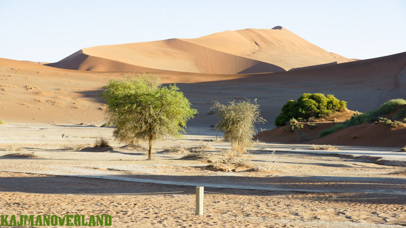Wyschnięte dna dolin pokrytych białą, lekko błyszczącą warstwą minerałów, od czasu do czasu rosochate kikuty drzew lub niewielkie kępy krzewów, abstrakcyjnie zielonych w tej pustynnej scenerii. A wokół morze pomarańczowego piasku... Niesamowite!