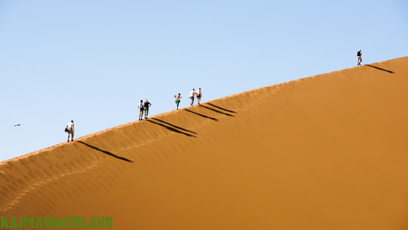 Dzisiaj natomiast zerwaliśmy się jeszcze po ciemku, by punktualnie o 6:15 wyjechać z obozu w stronę słynnych wydm. Większość uważa za punkt honoru powitać wschód słońca na Dune 45, ale dopiero o świcie można wjechać do parku, więc i tak trudno jest zdążyć, żeby w licznej grupie truchtem tam wbiec. Tymczasem w Dead Vlei jest jeszcze o tej porze bardzo przyjemnie, bez upału, a brak turystów znakomicie wzmacnia przeżycia. W pierwszej kolejności odwiedziliśmy więc „martwe bagno“ czyli Dead Vlei, a dopiero później majestatyczną Dune 45, czyli jedną z największych wydm na świecie (a na pewno jedną z najpiękniejszych!).