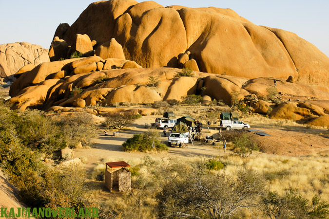 Pięknie ulokowany camping otoczony zewsząd monolitycznymi, wygładzonymi przez erozję skałami w pomarańczowo-czerwonych barwach.