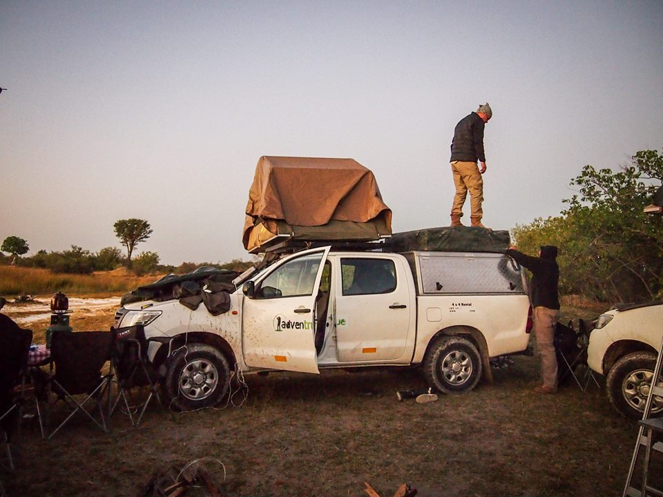 Czas wziąć się do offroadowej roboty. Jeden z nas wychodzi przez szybę, żeby nie otwierać drzwi. Reszta aut stoi przed przeprawą i z niedowierzaniem patrzy na bulgoczącego Hiluxa. Co tak patrzycie - dawać liny, trapy wyciągać. A co to są trapy ? No cóż, większość nie była przygotowana na takie atrakcje. Damy radę, tylko uwaga na hipcie! Są blisko! I w tym momencie hipki same dały o sobie znać dosłownie 40 metrów dalej. Wszyscy wskoczyli do aut, ale po jakimś czasie pojęli, że nie ma innego sposobu jak praca całego zespołu. Druga próba prawie się udała i auto stanęło 3 metry przed końcem brodu. Kilku chłopa wskoczyło do wody i pierwszy Hilux wydostał się z wody. Reszta już jakoś poszła - linki holownicze spełniły swoje zadanie i po ok. 40 minutach reszta Hiluxów przejechała przez wodę. Było pewne, że nie dotrzemy dzisiaj na Third Bridge. Zmrok zapada, czas na decyzję. Trudno, nie ma co czekać, auta ustawiamy w czworobok i wyznaczamy nimi zamknięty okrąg. To będzie nasz obóz na dzisiaj. Nie ma wyjścia, rozpalamy ogień i zakładamy obóz w samym sercu Okavango.