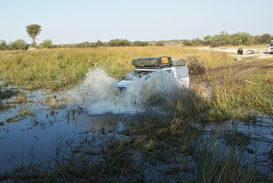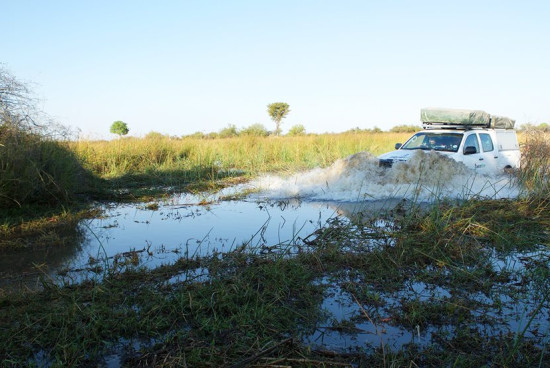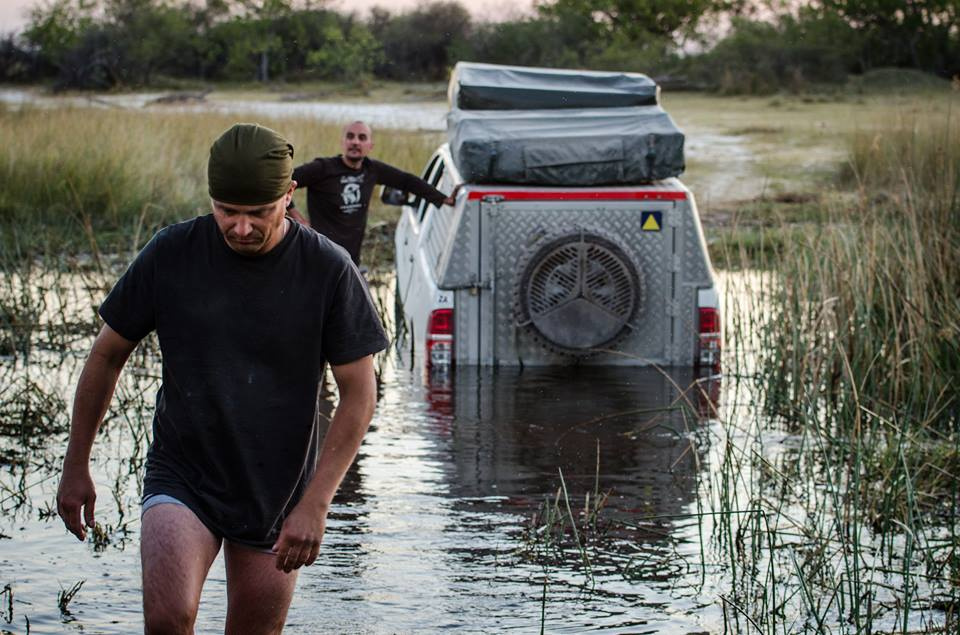 Wreszcie wjeżdżamy do rezerwatu Moremi i jedziemy do serca Delty Okavango. Jest bardzo mokro jak na zimę. Im dalej zapuszczamy się w głąb delty, tym większe problemy z trakcją auta. Chcemy osiągnąć Third Bridge, jeden z najdzikszych campingów Moremi. To trudno dostępne miejsce okazało się tym razem nieosiągalne. Kolejne przeprawy przez zalane drogi są coraz trudniejsze. Objazd za objazdem, bród za brodem. Przejeżdżam pierwszy i grzęznę w połowie rzeki. Całkiem głęboko, tylne koła zapadają się coraz głębiej, a woda zaczyna napływać do środka.