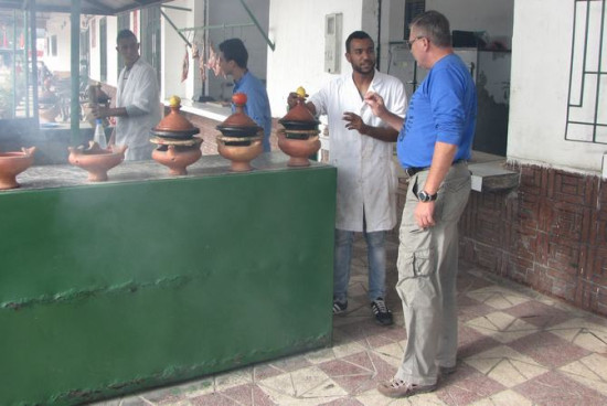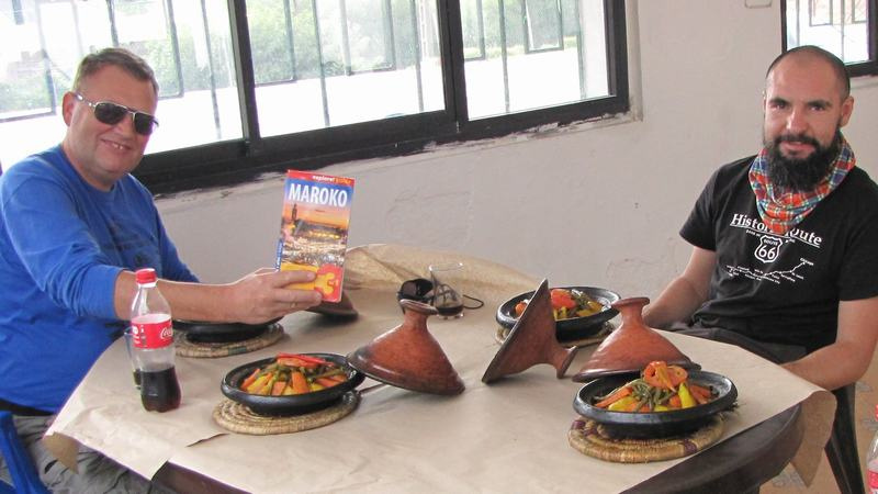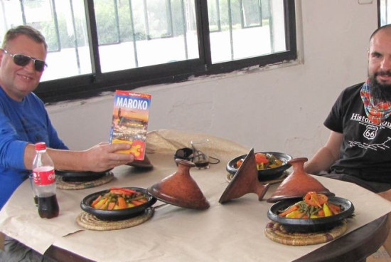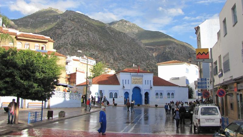 Szybko docieramy do Gibraltaru, jednak pochmurna pogoda i jej totalne załamanie, pokrzyżowało nam plany jego zwiedzenia. Z trudem przebijamy się przez deszczowe nawałnice. Pozostało nam uciekać z Europy, jedziemy jeszcze, 15km do Algeciras i najbliższym promem typu „fast”, przedostajemy się godzinnym rejsem na drugą stronę Cieśniny Gibraltarskiej do afrykańskiej części Hiszpanii, do Ceuty (koszt 170€ za 2 osoby i auto). Z marszu stajemy na granicy z Marokiem i po kilkunastu minutach, jedziemy już w kierunku Chefchaouen. Na trasie wymiana pieniędzy, 1€ = 10.70 MAD, tankowanie 1l = 8,28 MAD (dirham marokański). Wreszcie pogoda poprawia się na tyle, że można na sucho wysiąść z auta. Pierwszy zajazd i oczywiście marokańskie pachnące kulinaria. Tagine, tajine, tażin, tadżin… niezależnie od pisowni, wspaniałe danie, którym zachwycaliśmy się w Maroku, będąc tutaj już wcześniej i nadal nam smakuje. Same składniki dania nie zaskakują (można znaleźć podobne przepisy jednogarnkowe w wielu kuchniach świata). Sekret tkwi w glinianym naczyniu z przykrywką-stożkiem, które stwarza „mikroklimat” w środku łącząc ze sobą różne smaki i czarując doskonały wielowymiarowy smak, któremu danie zawdzięcza nazwę… i oczywiście w przyprawach, których są tutaj kolorowe stosy. Nasza trasa biegnie przez Tetuan, a tam… wizyta króla. Jak okiem sięgnąć… wojsko, policja, żandarmeria, jednostki najspecjalniejsze ze specjalnych i… flagi… mrowie flag. Poddani wyczekują, by choć ukradkiem spojrzeć na „monarchę oświeconego”, miłościwie panującego Muhammada VI. Na tyle wcześnie docieramy do starego Chefchaouen, że mamy cały wieczór na zwiedzanie tego uroczego miasteczka, położonego na stromych zboczach gór Rif.