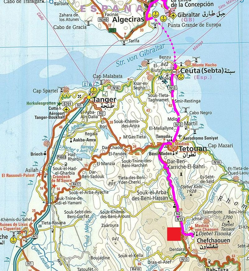 Salar > Algeciras > prom do Ceuty > granica z Marokiem > Chefchaouen ( nocleg na parkingu hotelowym)- 330km