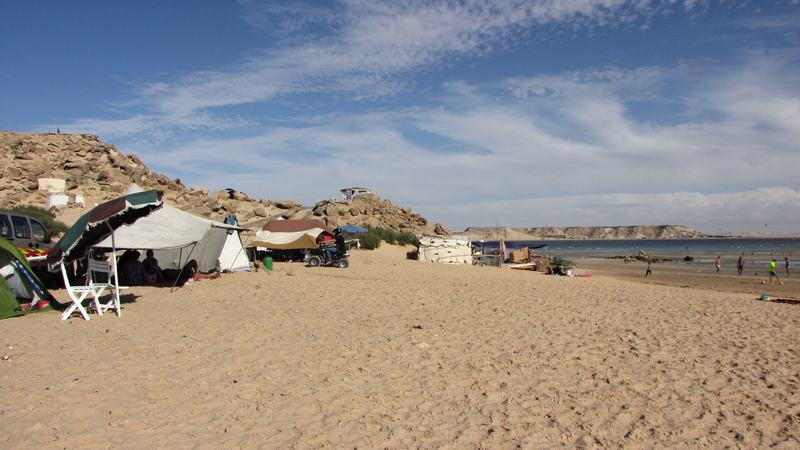 Jest stabilnie sennie, a ponieważ nie posiadamy automatycznego pilota, wykonaliśmy skręt na dziką plażę „Plage Aouzioualte”, by tam napić się kawy i popatrzeć na wraki statków. W porze obiadowej jesteśmy na wysokości Dakhli, ostatniego, najbardziej wysuniętego miasta będącego w obecnych granicach Maroka. Miasto położone jest na wysuniętym półwyspie, oddalone 42km od lądu. Jedziemy tam. Poza odmiennymi krajobrazami półwyspu Yala, wręcz przestrzennymi, a ponieważ niebo i ziemię zagarnęły dla siebie ptaki, ludzie są tam tylko epizodem. W mieście, mamy sposobność zjeść przyzwoity obiad (tajin) i zakupić warzywa. Miejsce to jest licznie odwiedzane przez emerytowanych europejczyków z Francji i Hiszpanii, w celu spędzenia tu zimowego czasu – zawitaliśmy na jeden z campingów. Ale też, jest to nieodkryty zakątek surfowego świata… taki kite-raj pośrodku niczego. Dzisiejszą podróż kończymy w osadzie C.Bir Gandouz, położonej 80km przed granicą z Mauretanią. Śpimy na parkingu przed hotelem, panuje tu względny spokój… pomimo iż w telewizorze z okiennicami zamykanymi na kłódkę… leci jakiś ważny mecz.