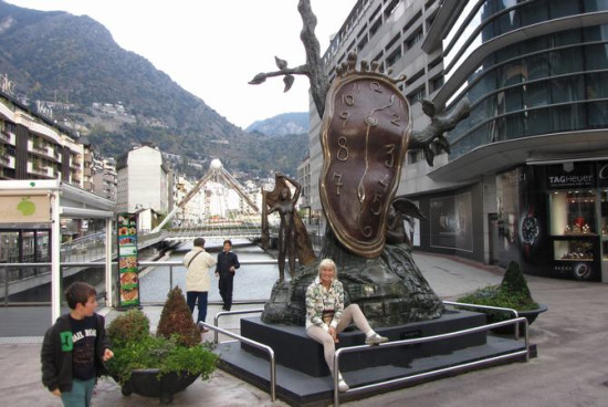 Andora la Vella (Stara Andora) to stolica i zarazem największe miasto Księstwa Andory, położone we wschodnich Pirenejach na terenie malowniczej doliny Gran Valira, na wysokości 1023 m n.p.m. No cóż, położenie wspaniałe, natomiast miasto nie robi zbyt zajmującego wrażenia… coś w stylu francuskich, nowoczesnych wysokogórskich kurortów alpejskich… wielkie eleganckie blokowisko. To taki mikro Hongkong, ogromny sklep wolnocłowy z drogimi restauracjami, salonami samochodowymi, sklepami dla motocyklistów i… skrzywionym zegarem czasu… czyżby zaznaczał powolny ruch w machinie snów?… a o czym to rozmawiają Andorczycy?… „wczoraj znowu była promocja butów”? Wybraliśmy się do jednej z restauracji na obiad, ale nie zawładnął naszymi przeżyciami smakowymi. Zamierzaliśmy zostać na nocleg w mieście, ale aura wielkiej galerii, jakoś nie przypadła nam do gustu, toteż jeszcze tego dnia, przejechaliśmy do Hiszpanii. Nocleg na campingu w Organya (10€ od os.).