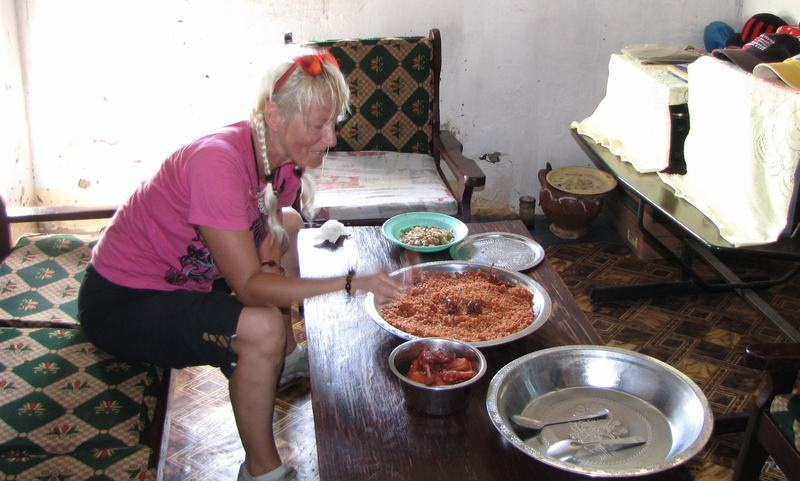 Nasz przewodnik zaproponował nam obiad w jego domu, z czego skorzystaliśmy, co było osobliwym epizodem. Siedzieliśmy na podwórku, gospodyni gotuje dla nas coś na ogniu, dzieciaki kręcą się wszędzie. Kiedy nadszedł czas obiadu, na stół wjechała potężna micha ryżu z przyprawami, smażona cebula, gotowana dynia i… mocno wybiegany kurczak, a raczej kurczątko (koszt 1.200 dalasi za nas troje).