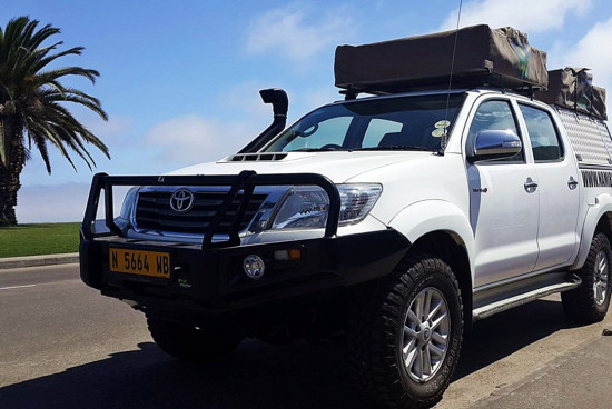 Pakujemy się do naszej Toyoty Hilux: dwa namioty na dachu, w ogromnym bagażniku mieści się wszystko co do życia przez 3 tygodnie będzie nam potrzebne: lodówka, butla gazowa z palnikiem, skrzynia z naczyniami, skrzynia na jedzenie, torba ze śpiworami, krzesła, stolik, no i nasze bagaże (zdj. Bocian Safaris).