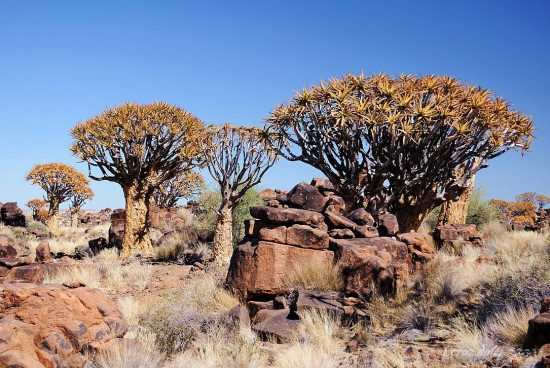 Dziś naszym celem jest dojechać w pobliże Fish River Canyon. Mamy przed sobą prawie 600 km drogi. Za oknem początkowo przepiękne widoczki, powoli zamieniają się w trochę nudnawą płaskość. Marcin co chwila przysypia ze zmęczenia, ja oczywiście trwam na posterunku i pilnuję, żeby nie przegapić czegoś ciekawego po drodze. Po kilku godzinnej jeździe zatrzymujemy się w Kokerboom Forest (albo Quivertree Forest) na farmie Gariganus (wstęp 30 NAD), żeby pooglądać drzewa kołczanowe. Koker w języku afrikaans oznacza kołczan, boom to drzewo, a nazwa drzewa pochodzi stąd, że plemiona Buszmenów wykorzystywały ich twardą ale giętką korę do wyrobu kołczanów na swoje strzały. Drzewa kokerboom to najwyższy gatunek aloesu – osiągają do 9 metrów wysokości i mogą żyć ponad 200 lat. Rosną tylko w Namibii i RPA. Na farmie Gariganus rośnie około 250 drzew stąd nazwano je lasem. Kokerboom Forest został ogłoszony pomnikiem narodowym Namibii. Dodatkową atrakcją tego miejsca są skały dolerytowe nazwane Giants Playground (Placem Zabaw Olbrzymów) datowane na 180 mln lat. Jadąc do Namibii nie można opuścić tego miejsca.