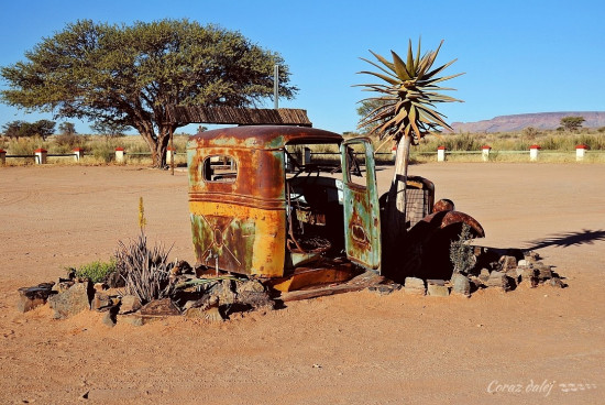 Po południu docieramy do Solitaire – malutkiego miasteczka w Parku Narodowego Namib-Naukluft. Na to urokliwe miasteczko składa się stacja benzynowa, recepcja campu, poczta, piekarnia z kawiarenką, w której pałaszujemy przepyszną szarlotkę – wizytówkę tego miejsca. Dookoła tych kilku budynków są porozrzucane wraki samochodów, także tych luksusowych, jak Hudson Hornet z 1941 r.