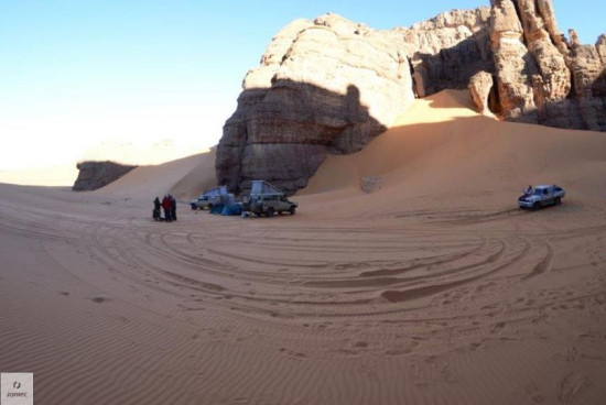 Rano szybko się spakowaliśmy i po śniadaniu odpaliliśmy dronu, aby po filmować tą okolicę. Przewodnik prowadził nas dalej w miejsca gdzie trzeba było podjechać, aby zobaczyć piękne widoki. Zatrzymaliśmy się również, aby porobić zdjęcia i po filmować trochę kamerami i dronem. Teren ten, chociaż wygląda podobnie - skaliste góry przysypane piaskiem, to jednak za każdym razem jest inny. Zatrzymaliśmy się przy niedużej ostrej skale, na której były malowidła zwierząt, a z drugiej strony postacie ludzkie. Tuaredzy śmiali się, iż jest to pornografia, trochę można się dopatrzeć aktów miłosnych. Potem jedziemy dalej przez równiny z małymi wzniesieniami a czasem kamieniami a po obydwu stronach wydmy a za nimi skały. Na noc zatrzymaliśmy się nad piękna doliną. Przed nami fantastyczny widok, chyba najpiękniejszy z całej wyprawy. Kaśka z Tomkiem swój obóz rozbili w dolinie przy mniejszej skale.