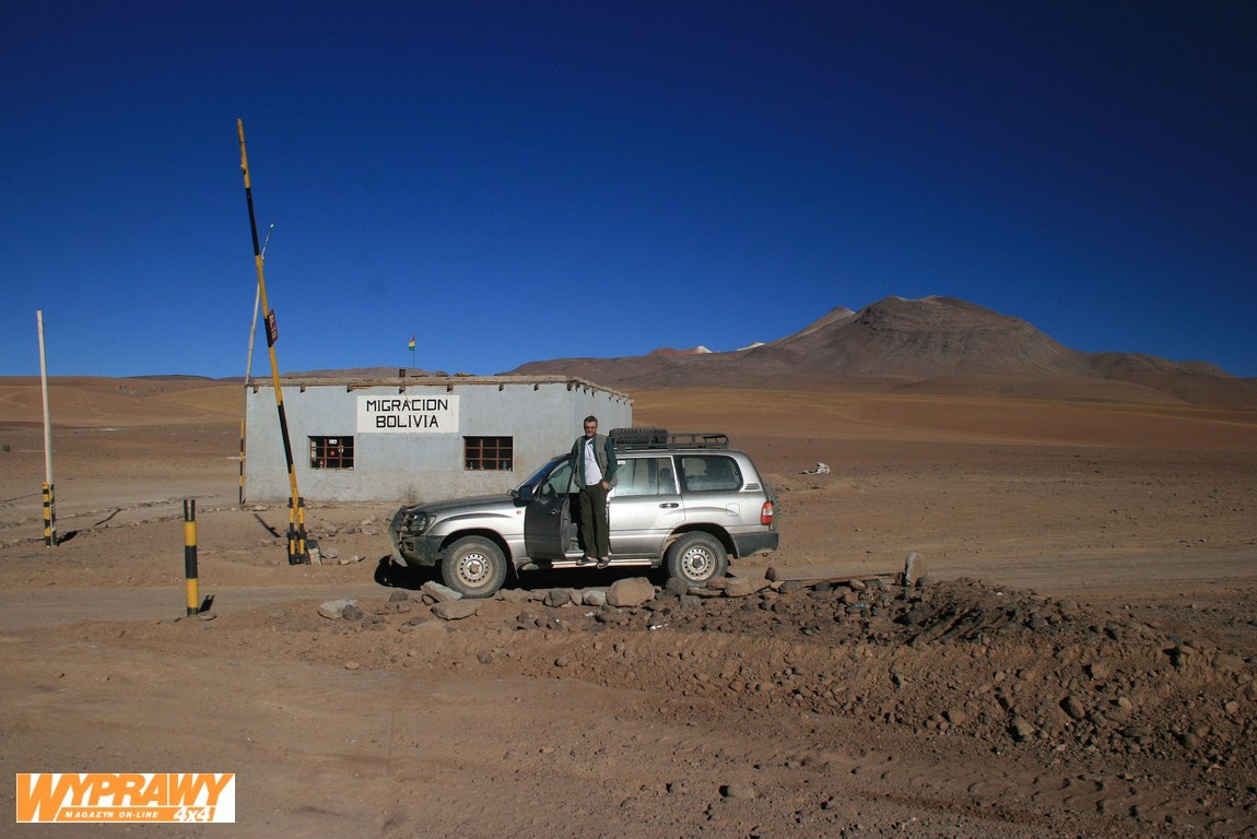 Wracamy na główny asfalt wiodący do Argentyny w kierunku Paso de Jama i wypatrujemy niewyraźnego skrętu na północ w kierunku Boliwii. Choć na mapach ta droga jest zaznaczona jako główna, w rzeczywistości znalezienie skrętu wymaga sporo uwagi. Okazuje się, że to mało wyraźny trakt pośród pustkowi Atacamy. Docieramy do granicy w miejscowości Hito Cojones, która składa się zaledwie z jednego budynku –biura straży granicznej. Pan pogranicznik siedzi samotnie na granicy w nieogrzewanym budynku i, jak powiedział, poprzedni samochód obsłużył wczoraj (teraz jest godzina 17).