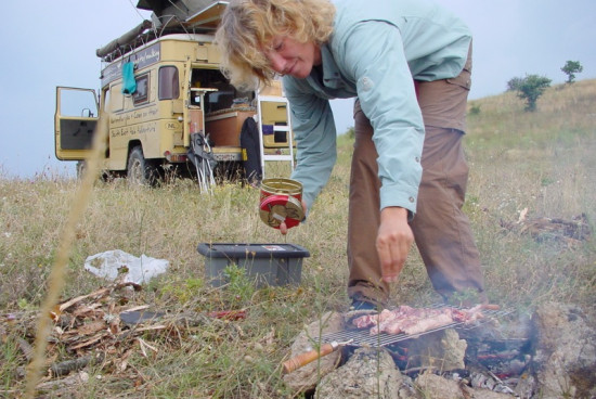 Wiatr jest tak silny i przejmujący, że gotowanie na zewnątrz odpada, choć Coen bardzo to lubi. Tym razem jednak ustawia w samochodzie płytę grzewczą. Gotujemy w Land Cruiserze tylko w przypadku bardzo złej pogody. W środku gromadzi się para, robi się gorąco. Trzeba się dobrze przygotować, bo gdy kuchenka jest rozłożona, jest tak ciasno, że trudno się ruszyć. Wtedy zwykle ja decyduję, co będziemy jeść, kroję warzywa, wyciągam produkty ze schowków i podaję je Coenowi.