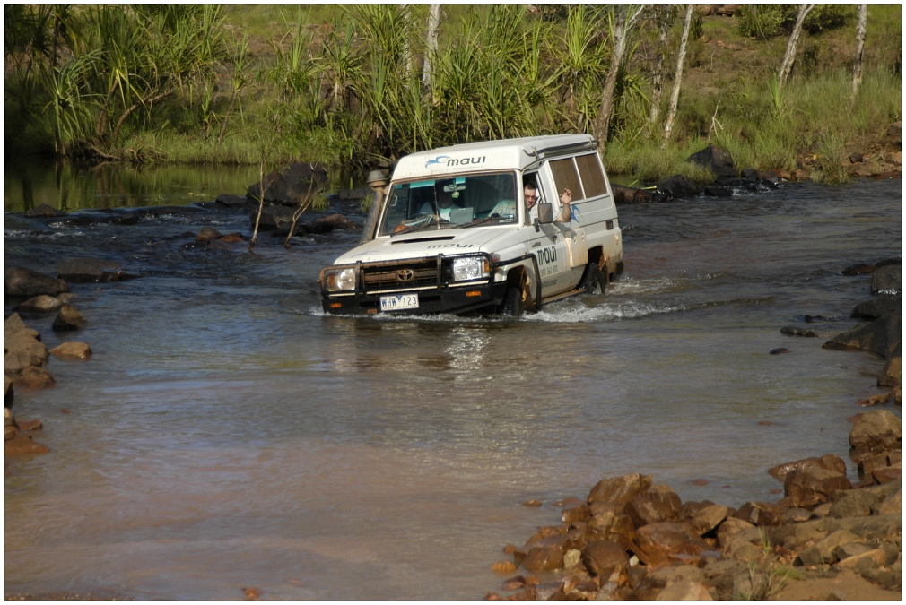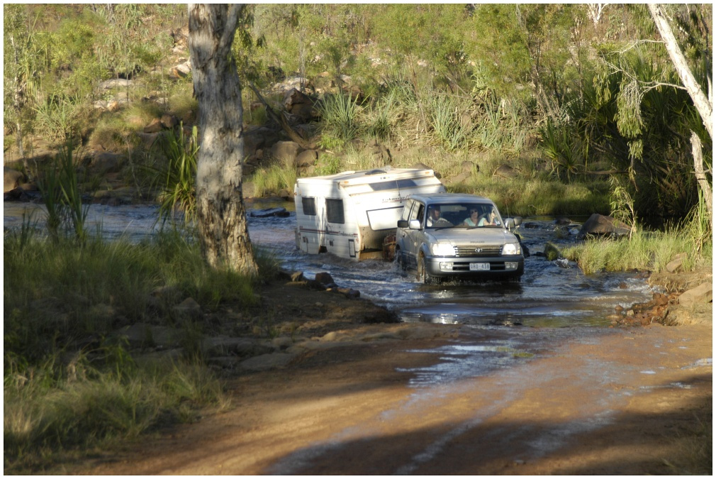 Tak naprawdę po Pustyni Tanami, teraz dopiero wjeżdżamy na dziki i odległy obszar. Przekraczamy Pentecost River znanym brodem Bluey O’Malley i zaczynamy przygodę z Gibb River Road. Droga ta słynie w Australii jako jedna z najbardziej niedostępnych i nieprzewidywalnych. Duża ilość rzek przekraczanych w bród, obfitość opadów stanowiących o głębokości brodów i malownicze widoki stanowią o jej niepowtarzalności. Jedziemy wciąż na północ, naszym celem jest Honeymoon Beach, najdalej na północ dostępny samochodem punkt na Kimberley. Kalumburu Road, droga, która tam prowadzi została zbudowana dopiero w latach 70-tych. Całe zaopatrzenie dużej aborygeńskiej osady i misji katolickiej w Kalamburu odbywało się (i odbywa się nadal) przez morze bezpośrednio z Darwin ponieważ droga jest nieprzejezdna przez 9 miesięcy w roku. Widzimy ślady powodzi, świeżo odgarnięte zjazdy do rzek a co najciekawsze, zdjęcia rzek, które płyną drogą w porze deszczowej a w nich zatopione wielkie ciężarówki. Drysdale River Station, jedna z największych powierzchniowo farm w Australii na której znajduje się uroczy bar z ogródkiem piwnym corocznie jest zalewana przez wodę a rodzina Drysdale’ów prowadzi od kilkunastu lat ranking głębokości wody na podwórku. I dokumentuje to w swoistym muzeum farmy.