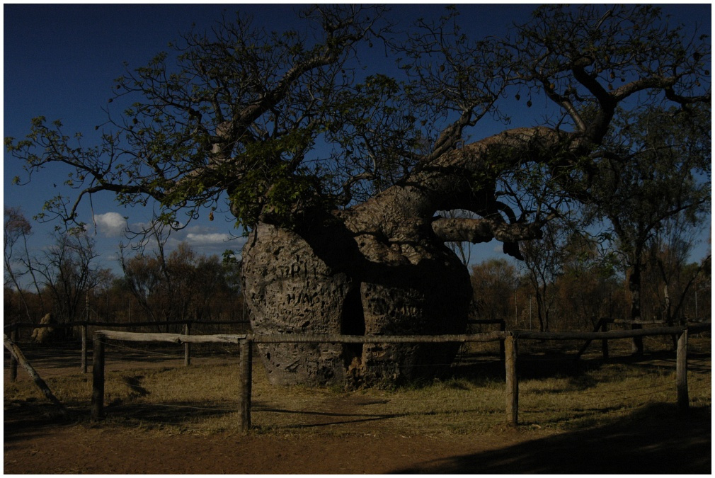 Nad Wyndham góruje wzgórze z punktem widokowym z którego można oglądać zlewisko pięciu rzek wpadających do zatoki Cambridge: Ord River, Fish River, Durack River, Pentecost River i King River. Miejsce niesamowite zwarzywszy na możliwość obserwacji pływów, które mają tutaj ok. 7 m wysokości i w bardzo szybkim tempie zalewają suche poldery. Mamy jeszcze pół dnia więc oglądając po drodze aborygeńskie malowidła naskalne dojeżdżamy na nocleg do wielkiego Boabu z dziurą w środku, znanego jako Boab Prison Tree, pełniącego onegdaj rolę polowego aresztu. Kolejna pamiątka z czasów polowań na Aborygenów.