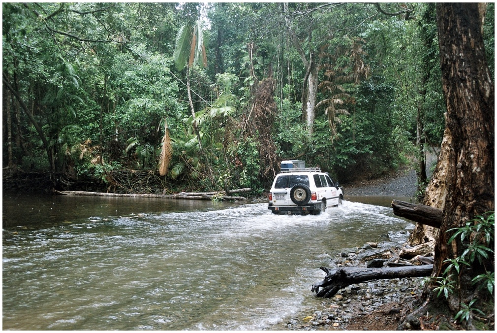 Wszystkie rzeczki, które przejeżdżam, są krystalicznie czyste i mają pyszną wodę. Coś dziwnego, wszak powinno padać, a nurt powinien być mętny i rwący. Nadzieja napawa me serce, może uda mi się dojechać do Bamagi? Przejeżdżam kolejne wzniesienie i mam to, czego chciałem – nagle widzę zapierający dech w piersiach widok na prawdziwą mętną rzekę pełną krokodyli. Dojeżdżam do brodu na Bloomenfield River koło miejscowości Wujal Wujal i widzę aborygeńskich cattlemenów w pickupie, zastanawiających się czy forsować bród, czy nie. Ja wracać nie chcę, więc po krótkiej rozmowie, ubezpieczając się nawzajem przeprawiamy się dobre 150 m przez rwącą i dosyć głęboką rzekę. Głęboką, bo samochód ostro znosi, a w kabinie pod pedałami mam wodę. Aborygeni mówią, ze cyklon jest coraz większy, a właśnie pojawia się nowy nad Cairns, więc wody będzie coraz więcej. W Cooktown potwierdzają mi prognozę i stan pogody, ale analizując ruch cyklonów oraz ich przemieszczanie, decyduję się jechać dalej przez kawałek Parku Narodowego Lakefield. I uciec przed cyklonami na północ. Kilkakrotnie przeprawiając się przez rzeki, w tym dosyć głęboką Laura River, dojeżdżam do Coen. Dowiaduję się, że dalej droga może nie być już przejezdna, a do Roadhouse’u Archer River na pewno nie dojadę, bo na brodzie przez Archer River trzy dni temu było 6 m wody. I żebym szybko stąd zmiatał, bo mimo że Laura River udało mi się przejechać bez problemu, wcale nie musi być tak ponownie – kilka godzin to bardzo dużo, a przecież jest to jedyna droga powrotna do Cairns.