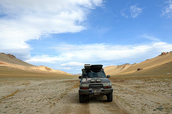 Za kolejną przełęczą ujrzeliśmy duże jezioro, które musieliśmy objechać wyprawiając skoki samochodami po kamieniach. Teraz nawet taki bobas z jurty mógłby nas wyprzedzić na piechotę. Dalej nasza droga powoli obniżała się w stronę doliny rzeki Hulżistyn. Tam wjechaliśmy na chwilę do wioski górny Bulgan, zasiedlonej przez Kazachów. Utrzymują silne kontakty z Kazachstanem. Dużo tu rosyjskich ciężarówek i prawie wszyscy mówią po rosyjsku, a dacan zastąpiony został meczetem. Trochę za długo kręciliśmy się po sklepikach, bo zainteresował się nami lokalny policjant. To strefa nadgraniczna, do Chin jest w linii prostej dziesięć kilometrów. Udało się nam jednak jakoś wykpić brakiem znajomości języka rosyjskiego i szybko wyjechaliśmy w góry, na nocleg, jak najdalej od ludzi.