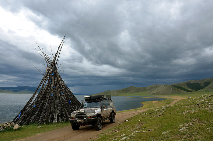 Gdzieś w środku dnia, środku bezmiaru pofalowanego stepu, natrafiliśmy na grupkę Mongolczyków i trzy półciężarówki Kia. Jedna była zakopana w mokrym po deszczu piasku. Szarpali ją jakąś Toyotą SUVem. Mają tu takich odmian dużo, w Europie nie spotykanych. Zamiast porządnych lin używali pasów do mocowania towaru na pace ciężarówki. Pasy się rwały i nic z tego nie wychodziło. Zatrzymali nas i na migi prosili o pomoc. Podjechałem bliżej, w piach i wyciągnąłem Kię. Na podziękę dostaliśmy miłe uśmiechy. Takie przypadki w podróży są tutaj częste, pomoc niesie się spontanicznie. Mimo bezustannego jeżdżenia po bezdrożach, Mongolczycy nie mają wrodzonej umiejętności radzenia sobie z samochodem. Nie grzeszą sprytem ani odwagą. Prowadzą jakoś tak niewprawnie i zaskakują nieoczekiwanymi i bezmyślnymi zwrotami. Gdyby nie ich dziecinna naiwność nie potrafiliby zmusić się do przejechania z jednego miasta do drugiego. Zwłaszcza kierowcy ciężarówek męczą swoje przeznaczone typowo na asfalty maszyny w koleinach, na trawersach i w rzekach czy błocie. Samochody terenowe są tu tak popularne jak za komuny w Polsce Maluchy. Natomiast Mongolczycy zupełnie nie importują terenowych ciężarówek, ani z Rosji, ani z Europy. Dziś widzieliśmy dwie ciężarówki utopione w rzece. Obie w stylu – ciągnik plus naczepa i to ta dłuższa, chińska, obładowana oczywiście po brzegi, a ciągnik z napędem na jedną oś. Tylko wiara w cuda może pchać kierowcę takim zestawem w szeroką rzekę metrowej głębokości. Zwłaszcza kiedy jedna ciężarówka już utknęła na środku w wodzie. Rosjanie są odważni, potrafią robić różne, dziwne rzeczy swoimi Uralami i Kamazami, ale nie rzucają się z motyką na słońce.