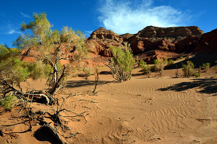 O świcie, tuż po wschodzie słońca, wyruszyliśmy w dalszą drogę na zachód, dnem wyschniętej rzeki Dzulganajn. Ślady kół UAZa niedługo znikły i pozostały nam jedynie słabo widoczne koleiny, prawdopodobnie sprzed roku lub dwóch. W miejscach, gdzie wiosenna woda z roztopów wyżłobiła grunt, nikły i tylko świadomość, że poza dnem rzeki nie ma co szukać drogi, utrzymywała nas ciągle w kanionie. Jego brzegi czasami budowały wysokie, pomarańczowe piargi, osypujące się wielkimi blokami zlepionego dawną siłą piasku. Czasami rzekę Dzulganajn ograniczały wydmy jasno-żółtego piasku. Woda na wiosnę podcinała im nogi, a letnim wiatrem wydmy atakowały ponownie.