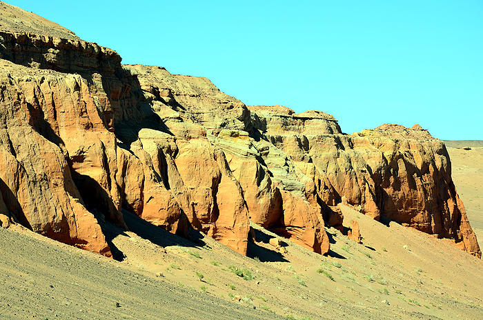 Ślady, które nas prowadziły, to znikały, to pojawiały się na powrót. Mieliśmy punkt na GPSie i w oddali widok ‘płonących’ klifów. Ostry pomarańcz piargowych osypisk, mocno odróżniał się na jednolicie, szarożółtym, płaskim po horyzont krajobrazie. Jednakże dopiero po godzinie jazdy, kiedy zbliżyliśmy się do ostatniej doliny, której południowy brzeg wyznaczały pionowe, pomarańczowe osypiska, dotarło do nas monumentalne piękno celu, do którego zmierzamy. Chciałem tu dojechać z powodu małego, wyblakłego zdjęcia z zakupionej w Dalandzadgad mapki, pomimo, że to nie po drodze. Zdjęcie miało się tak do rzeczywistości jak słowo ‘kosmos’ do tego co widzą zza iluminatorów kosmonauci. Dodatkowy opis wskazujący Khermen Tsav jako miejsce dla fascynatów skamielin wręcz obowiązkowe, bardziej mnie zniechęcał. Jednak przyjechaliśmy tu, a uroda Khermen Tsav dopiero zaczynała nas porażać.