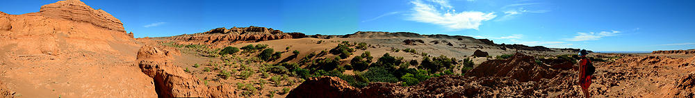 Na drugą przechadzkę wyruszyliśmy z Iwoną sami. Udało się nam wdrapać na najwyższy klif, rozdzielający dwa, urocze kaniony. Mogliśmy stamtąd podziwiać piękno Khermen Tsav z lotu ptaka. Udzielił się nam obojgu wzniosły stan myśli. W tej wyjątkowej scenerii poczuliśmy się wyjątkowi, a to że tu przybyliśmy stało się ‘ważną’ sprawą. W naturalny sposób żałowaliśmy tych, którzy w ostatniej chwili zrezygnowali z podróży z nami do Mongolii, bo minęła ich ta podniosła chwila ujrzenia Khermen Tsav. Jakże łatwo popadliśmy w megalomanię patrząc na mega powalający pejzaż dookoła. Nie znam jeszcze źródeł nieodpartej chęci dzielenia się z innymi tym co sprawia nam przyjemność. Może to ma potwierdzić, że wszyscy jesteśmy wrażliwi na to samo, a w ciżbie takich samych raźniej.