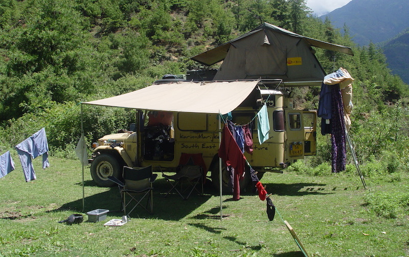 Phuentsoling to typowe miasto pograniczne, które żyje z handlu między oboma krajami, legalnego lub w szarej strefie, obfituje więc w sklepy i handlarzy. Gdy je opuściliśmy, na drodze na północ napotkaliśmy wiele punktów kontrolnych, ale w każdym szlaban był otwarty. Po roku podróżowania po Indiach nauczyliśmy się już, żeby się nie zatrzymywać, jeśli nikt tego wyraźnie nie zażąda, więc po prostu je mijaliśmy. Ani razu nie podniósł się alarm. W przemknięciu się bez zwrócenia niczyjej uwagi pomogła nam zapewne gęsta mgła, która pogrążyła okolicę w mroku. Zdecydowanie nie pomógłby nam w tym natomiast nasz samochód, który naprawdę rzuca się w oczy. Wkrótce wjechaliśmy doskonałą, gładką asfaltową drogą na wysokość 2000 metrów i znaleźliśmy się w głębi Bhutanu.
